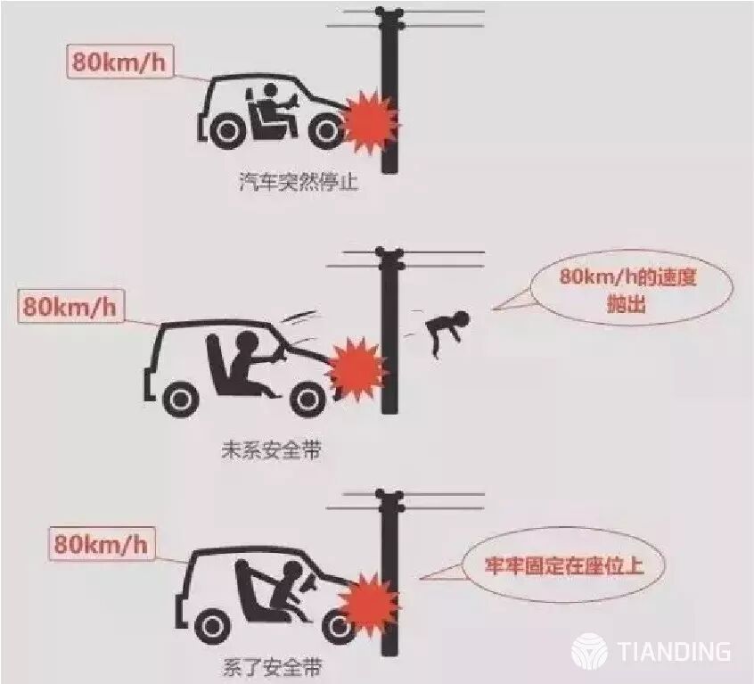 在80km/h的速度下,一辆汽车突然撞上前方物体而急剧减速并停车,车上人员会被安全带牢牢“按”在座位上,避免人体由于惯性撞上仪表盘,甚至撞破挡风玻璃甩出车外。