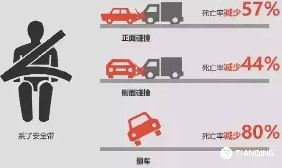 在一次可能导致死亡的交通事故中,规范使用安全带可使车内人员生还几率提高60%;发生事故时,若正面相撞,安全带可使死亡率减少57%,侧面相撞时可减少44%,翻车时可减少80%。