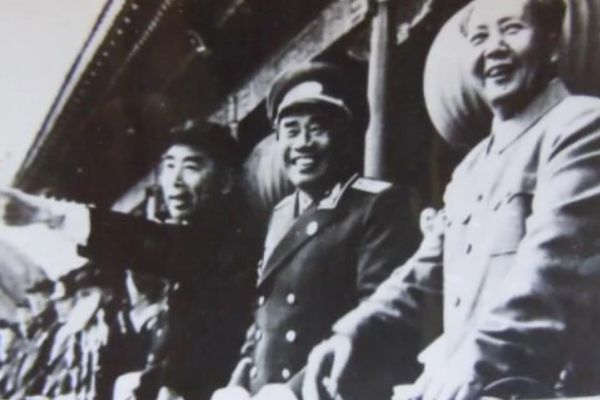 毛主席与朱老总、周总理在天安门与群众们欢度国庆时的场景。