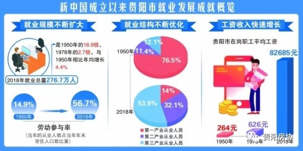贵阳网讯 10月14日,记者从国家统计局贵阳调查队获悉,新中国成立以来,贵阳市就业规模不断扩大,2018年贵阳市就业总量为276.7万人,是1950年的18.9倍,与1950年相比年均增长4.4%。
