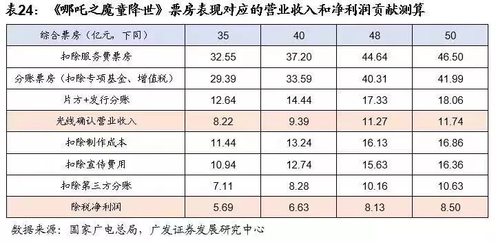 雷报【微信:leinewspaper +关注】在《姜子牙》谁投资?谁制作?谁受益? 文章中分析到,光线传媒在7月29日发布公告:截至2019年7月29日,光线传媒来源于《哪吒之魔童降世》的营业收入区间约为2亿元至2.4亿元。根据该区间票房收入推断,光线传媒票房收入比例应该在22.25%-26.70%之间。如果按照9月30日的49.49亿元票房计算,光线传媒将获得票房收入11亿元-13亿元,扣除服务费、专项基金、增值税、片方+发行分账、制作成本、宣发费用、第三方分账,扣除税后净利润在8亿元左右。