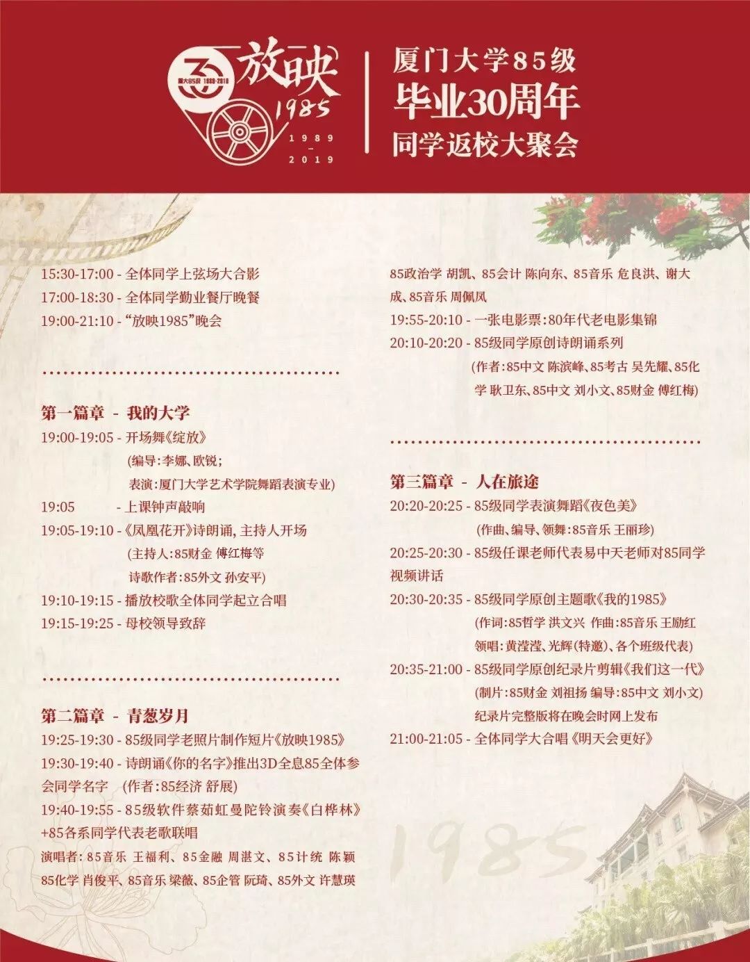 晚会在全体校友齐唱厦门大学校歌中拉开序幕。整台晚会以“放映1985”为主题,由“我的大学”“青葱岁月”“人在旅途”三部分组成。原创主题歌、原创诗朗诵、原创纪录片、原创舞蹈、曼陀铃演奏、3D全息85全体参会同学名字……一个个由校友自编自导自演的充满着年代感的节目,勾起了校友们对大学时光的美好回忆,抒发了大家对母校的浓浓情意。1985级任课老师易中天教授通过电话,给毕业多年的全体同学再上了一堂课,激发了大家为母校百年校庆添砖加瓦的热情。晚会在全体校友合唱《明天会更好》的歌声中圆满结束。