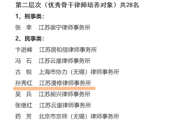 题 记根据市委、市政府“两办”转发的《关于实施无锡市名优律师人才培养工程的意见》精神,以加快培养高素质、专业化、复合型律师人才队伍,在无锡市律师协会组织开展的2019年度名优律师人才培养对象评审工作中,漫修律所共有三名律师列入本次无锡市名优律师人才培养对象: