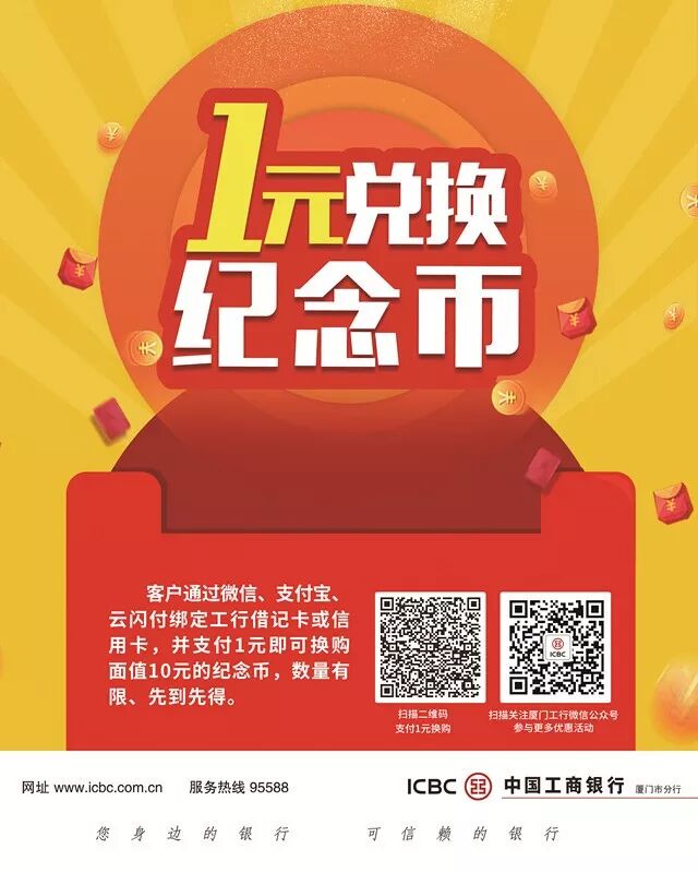 ●绑卡一元换购纪念币。纪念币难预约,心仪的纪念币总是抢不到?厦门工行准备了新中国成立70周年纪念币、改革开放40周年纪念币、高铁纪念币、猪年生肖纪念币等,现场通过微信、支付宝、云闪付绑定工行借记卡或信用卡,并支付1元即可换购面值10元的纪念币一枚,每人限兑一枚,数量有限,兑完即止。