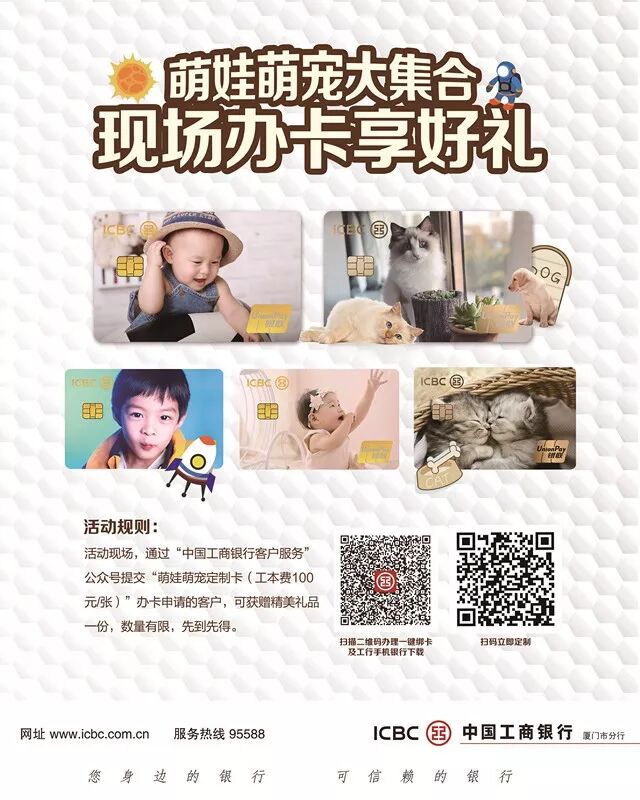 ●现场办卡有礼。把自己心爱的萌娃、萌宠印在银行卡面上,定格美好瞬间,定制属于你独一无二的工行卡!在读者节活动现场,通过“中国工商银行客户服务”公众号提交“萌娃萌宠定制卡”办卡申请,可获赠精美正版故宫文创礼品一份。