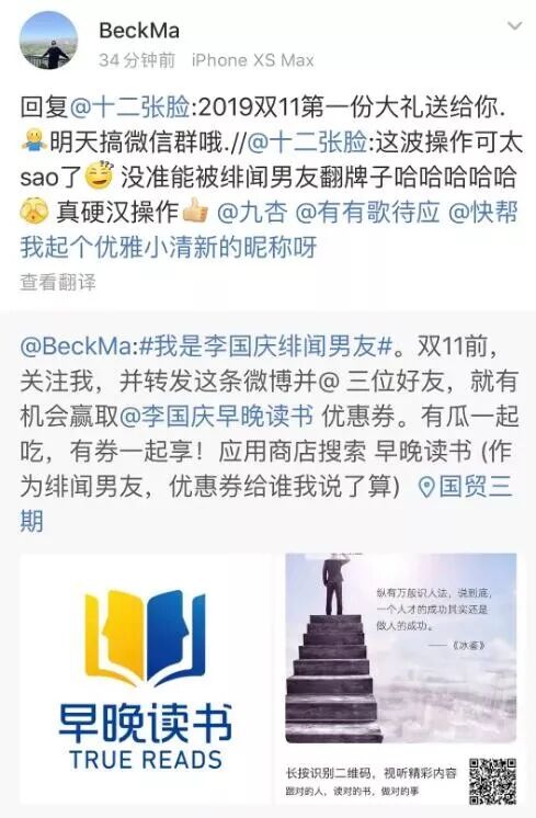 在微博上带话题词#我是李国庆绯闻男友#发布了抽奖微博。通过关注、转发,他将抽选网友,赠送李国庆新创业项目“早晚读书”的优惠券。