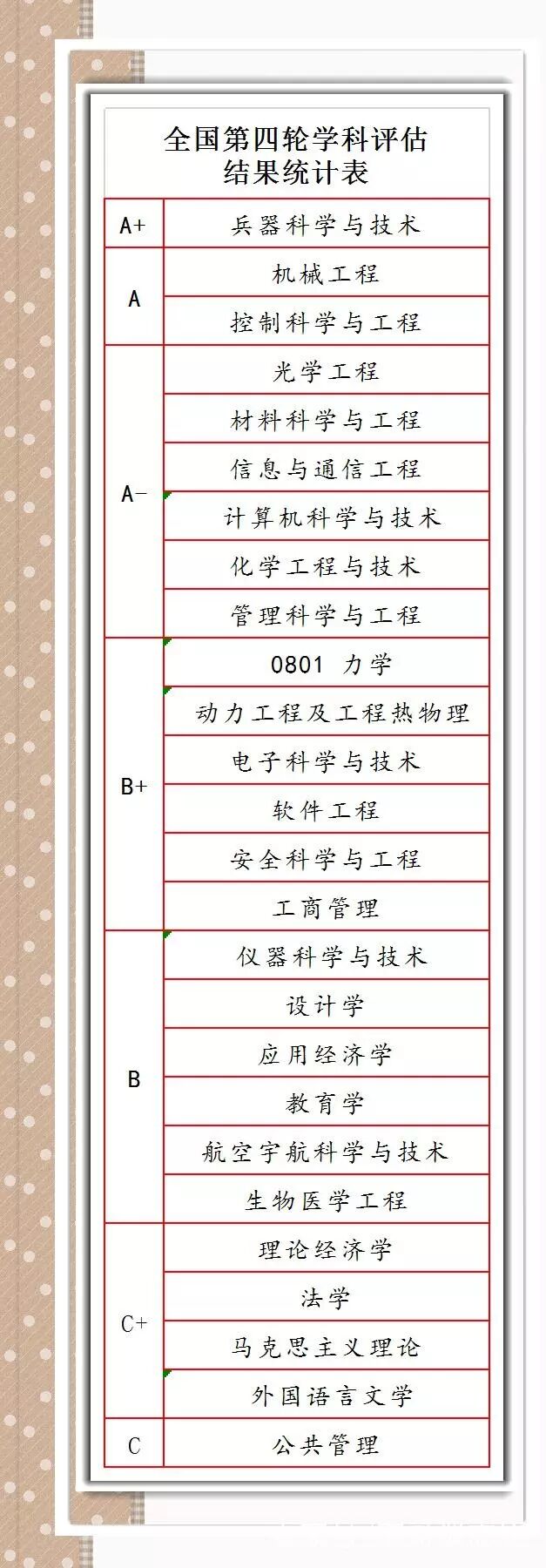 从全国第四轮学科评估结果来看。2017年,在由“学位中心”组织公布的全国第四轮学科评估中,“北理工”的兵器科学与技术学科获评A+类,机械工程和控制科学与工程2个学科获评A类,另有光学工程、材料科学与工程等6个学科获评A-类。