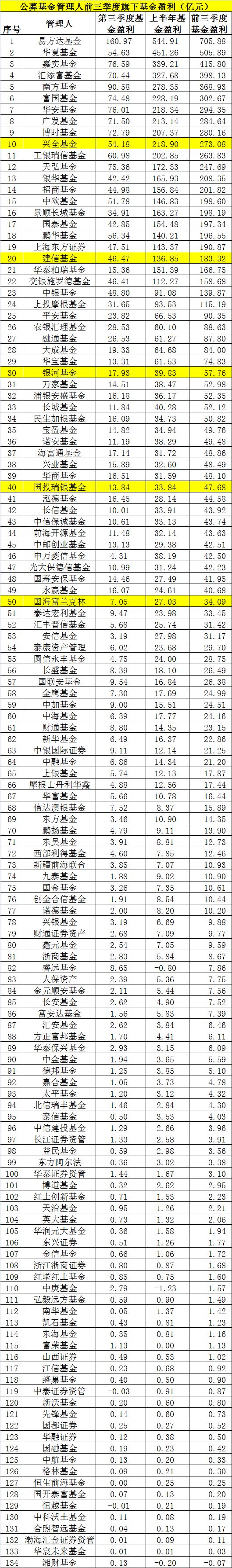 根据天相投顾统计显示,135家公募基金管理人中,共有24家前三季度旗下基金利润超过100亿元大关,其中又有14家净利润超过200亿,易方达基金前三季度旗下基金利润达706亿元,排名第一,华夏基金以506亿元基金盈利排名第二,嘉实基金、汇添富基金、南方基金、富国基金、华安基金、广发基金、博时基金、兴全基金也跻身前十,旗下基金净利润在270亿元以上。