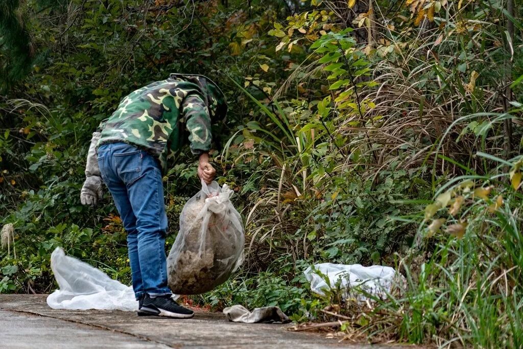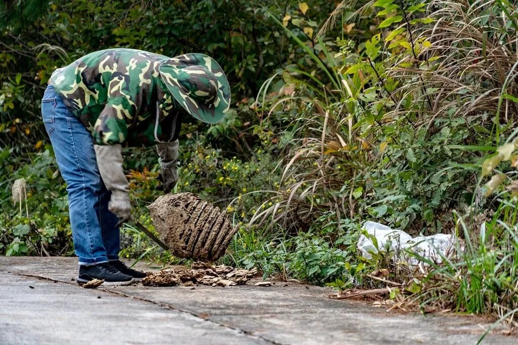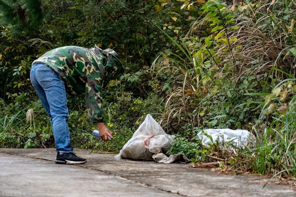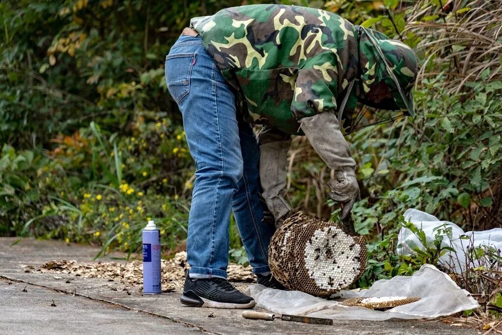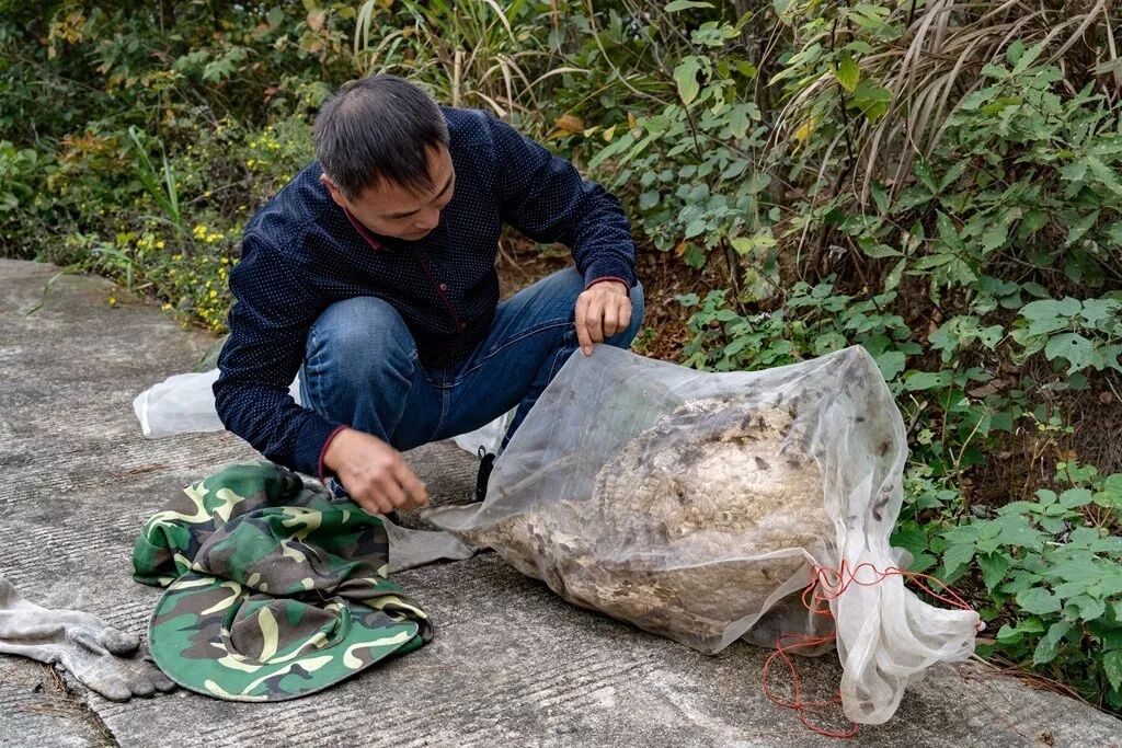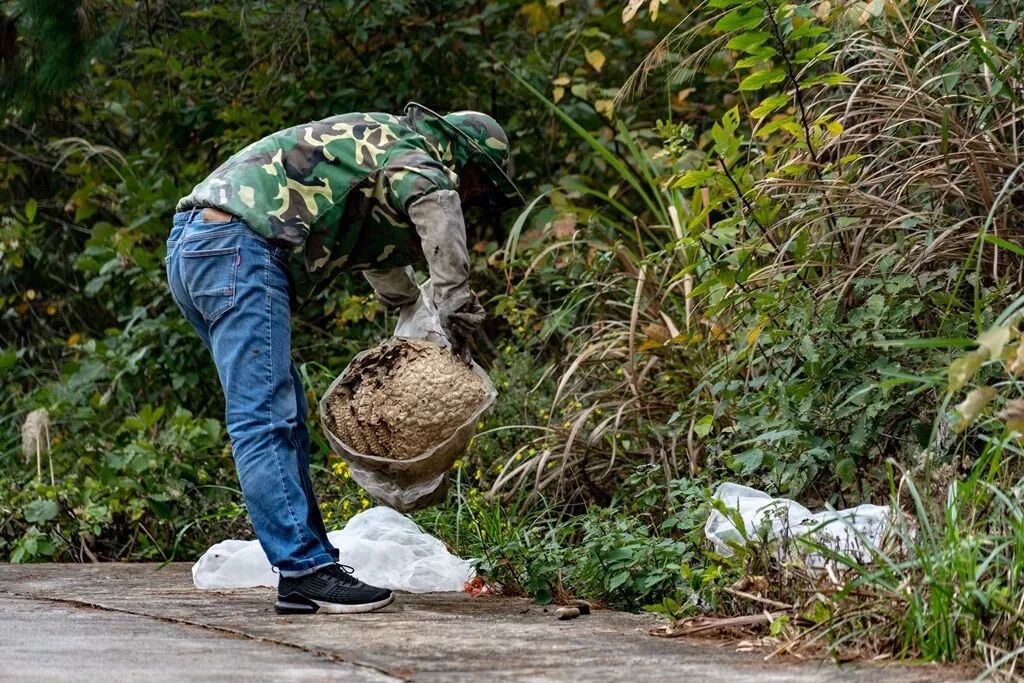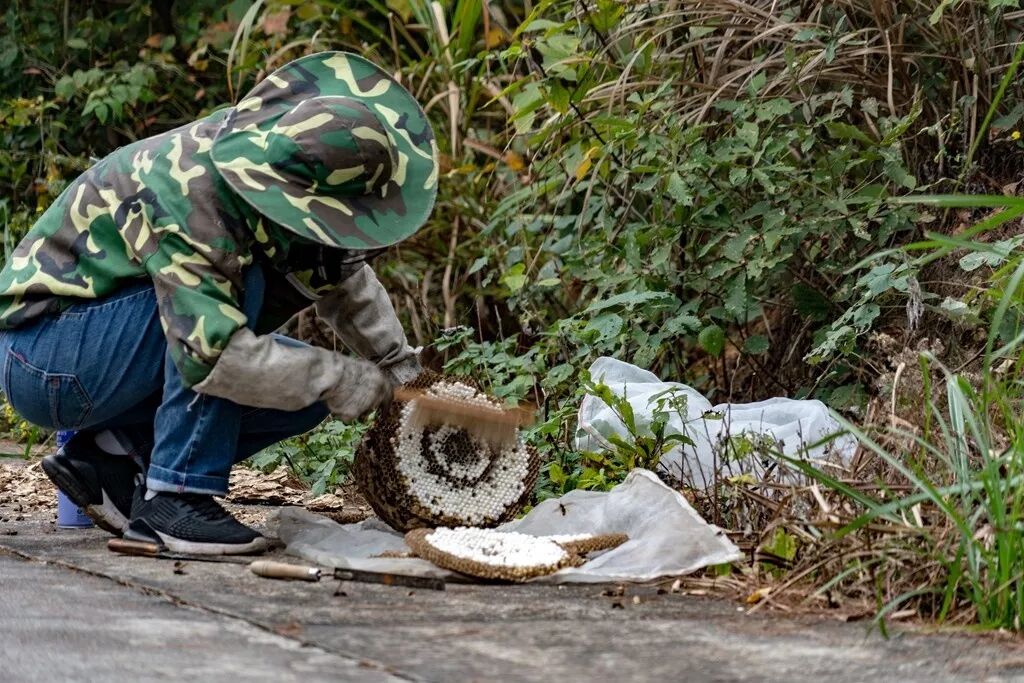 为了安全,小吴在上树时要我远离,因此没有拍照,但自他拎着战利品下树后,我则是给他来了个全记录,包括他对葫芦包的分割及蜂蛹挑取。