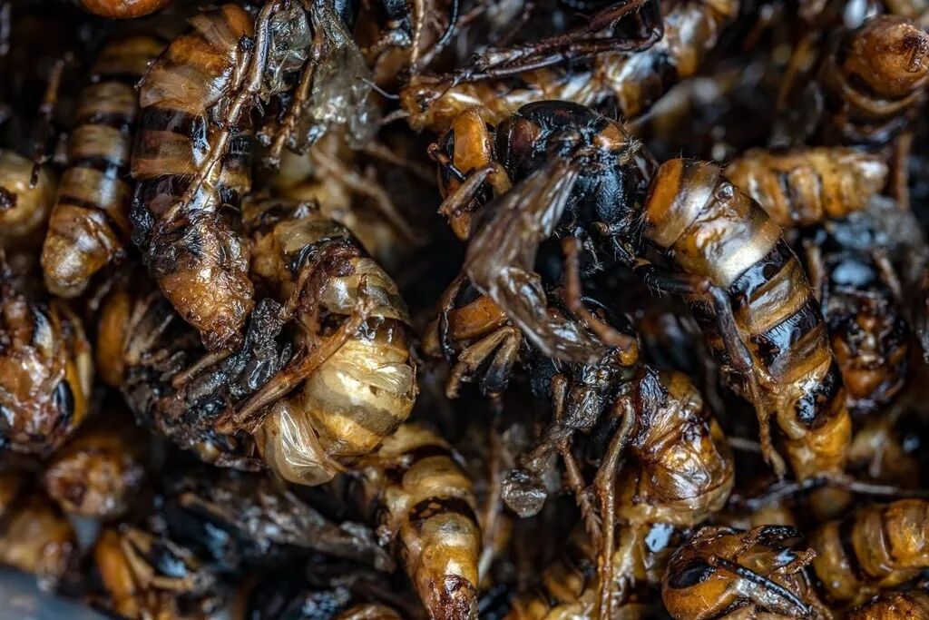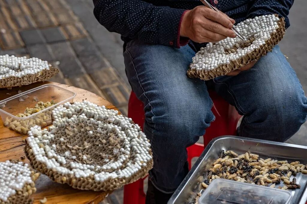 中午小酌,下酒的“油炸蜂蛹”就是最美味的一道菜。