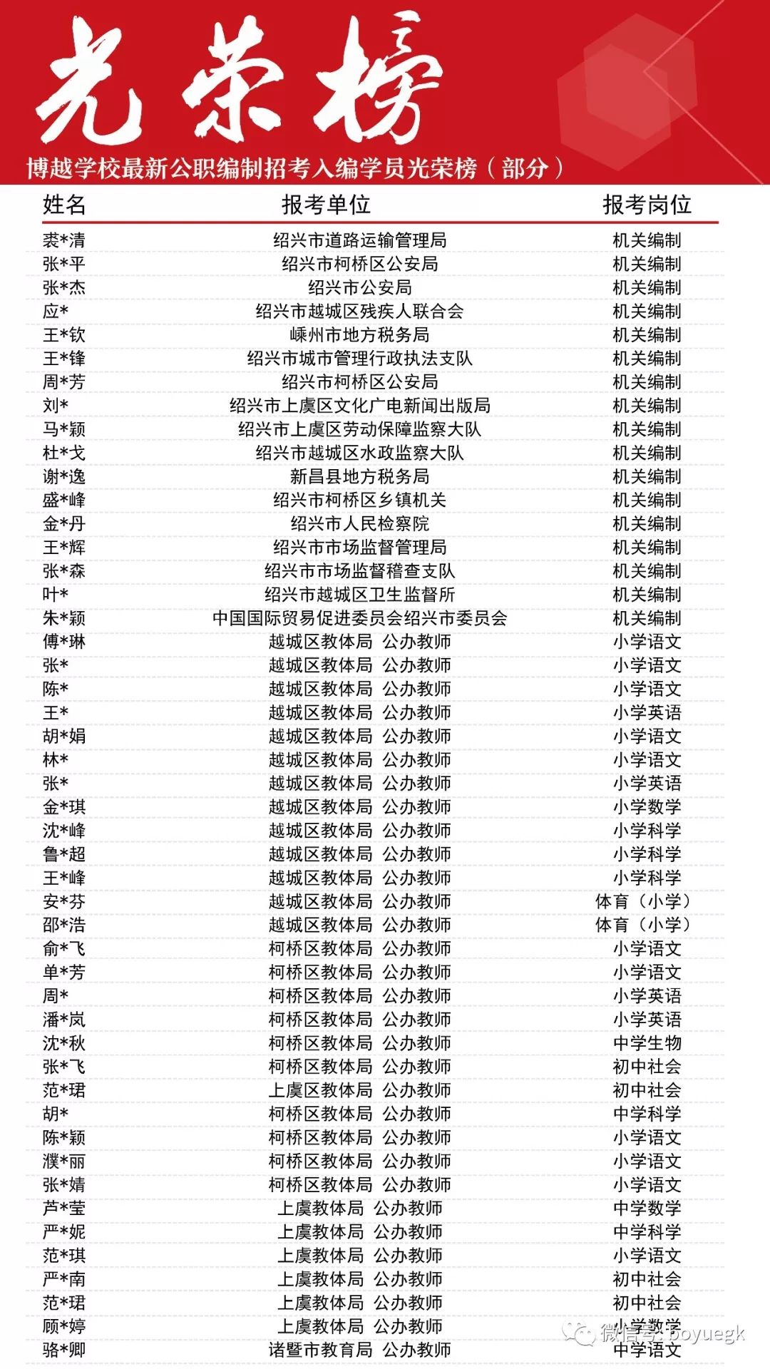 2009-2018年度,学校教研组多次押中公务员、事业单位招录考试笔试考题,学校成立至今已累计帮助5000多名学员录用成为“绍兴籍”公职人员(机关、事业编),历年越城区、柯桥区、上虞区、诸暨市、新昌县及嵊州市事业单位考试中,多名考生取得笔试所有考生第一名的佳绩,成为无可争议的全市公职考试培训基地。