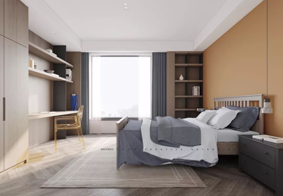 The combination of colors, with children's unique freedom and innocence. The integrated wardrobe, desk and transparent orange single chair are the echo of the whole space and the leap of materials.