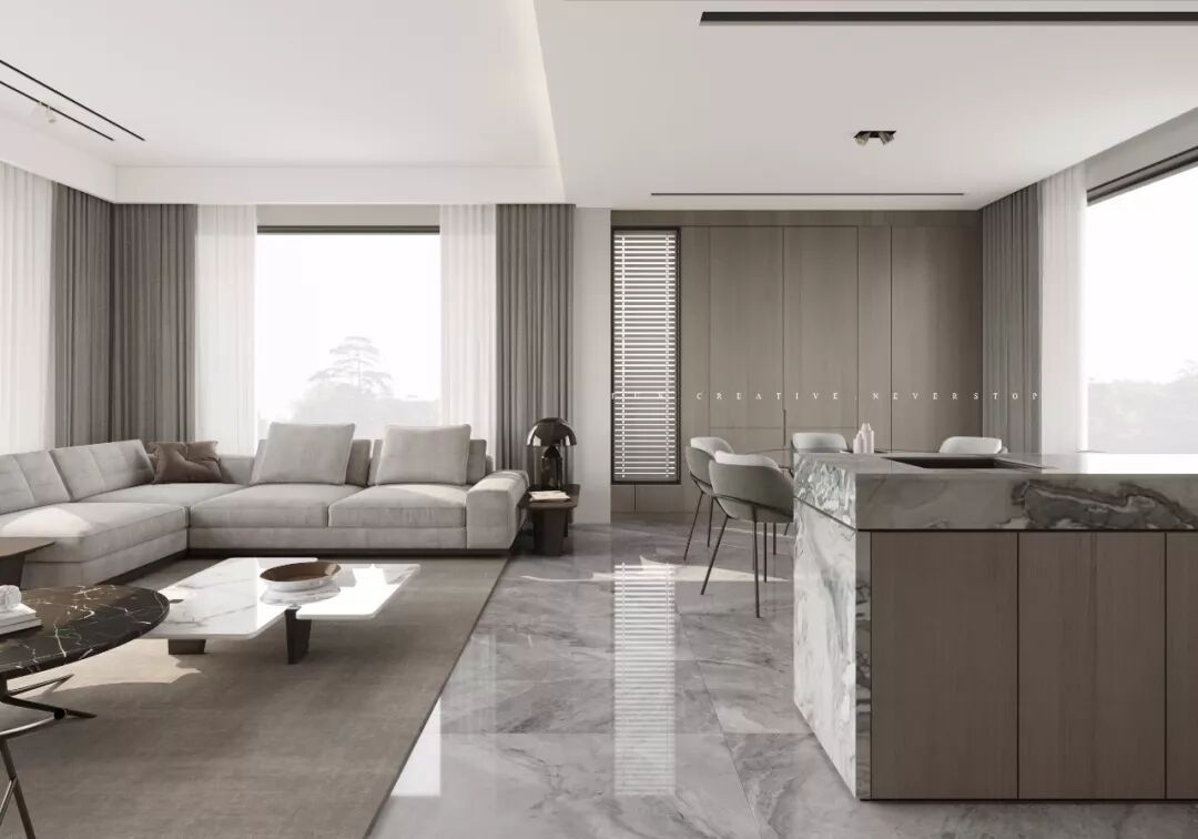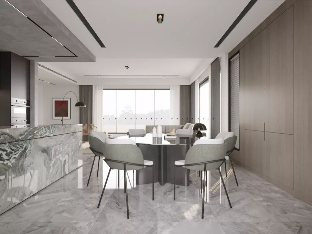 连通的客厅呈现出开阔、双倍的空间,更获得了双倍的光线和景致,通透明亮。客厅餐厅是家庭的生活重心,用开放、流动的设计手法给予充足的采光,更大的空间感。
