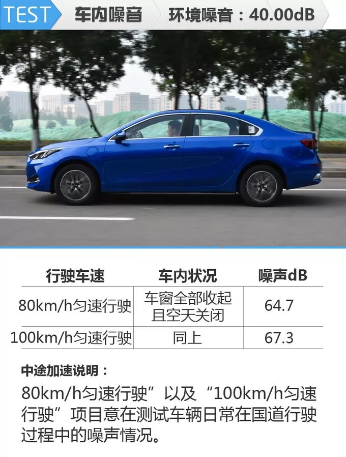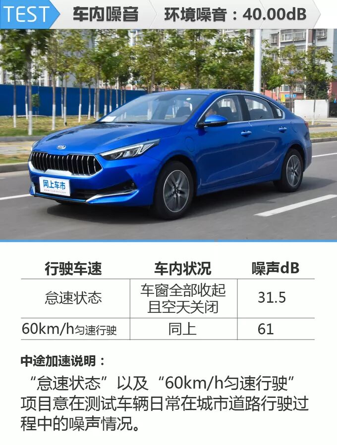清华测试是在交通部公路,交通试验场进行的,虽然是封闭场地,但多少会存在一些杂音干扰,在测试时外界环境的噪音为40dB。从测试结果来看,全新一代K3插电混动在怠速时的噪音为31.5dB,远低于环境噪音,可以说表现十分优异,车辆的座舱隔音性非常好,并且发动机噪音几乎可以忽略不计。