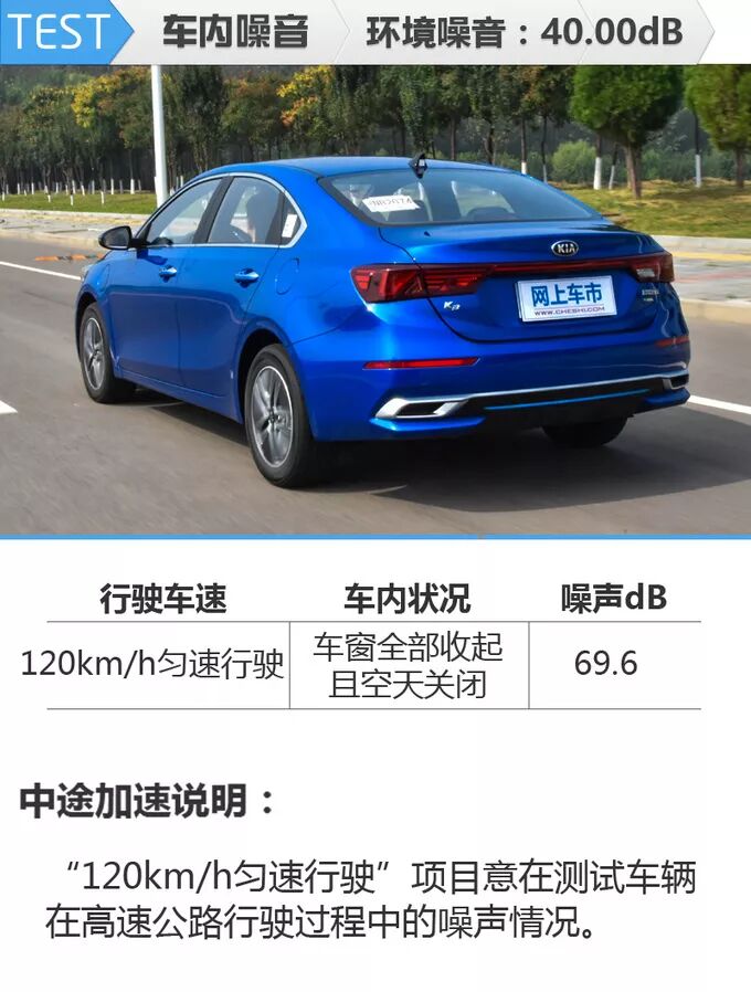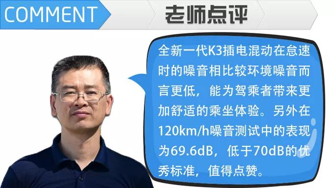 将车速提高到高速公路巡航状态的120km/h时,也是对车辆静谧性的重要考验。全新一代K3插电混动噪音值为69.6dB。清华老师给出了我们在120km/h噪音测试中的优秀标准为70dB,由此可见全新一代K3插电混动的表现依然很优秀。