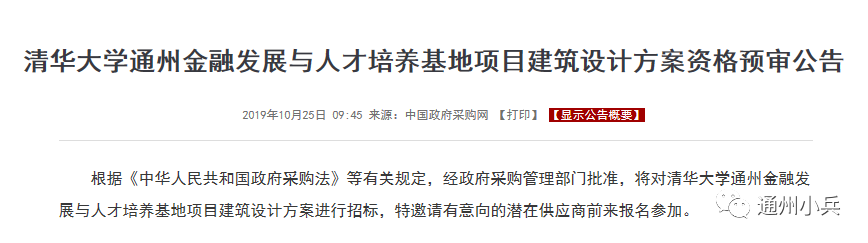 公告中显示,项目名称为:清华大学通州金融发展与人才培养基地。