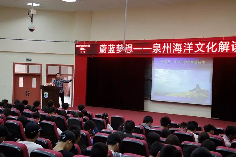10月23日下午,由泉州市委宣传部、泉州市社科联和石狮市社科联主办,泉州海洋职业学院承办的刺桐讲坛第37讲《蔚蓝梦想——泉州海洋文化解读》在学校报告厅举行。本次讲座由泉州市文化名家、石狮市博物馆李国宏馆长主讲,校党委书记梁松刚、党委副书记李明灿和在校师生200余人参加了讲座。