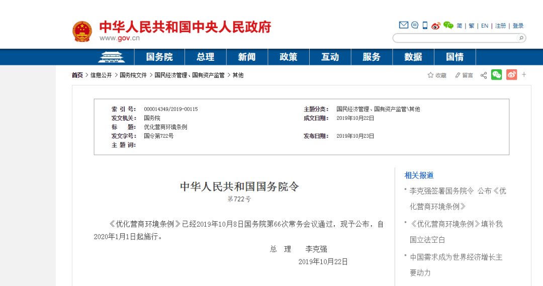 党中央、国务院高度重视优化营商环境工作,日前国务院总理李克强签署国务院令,《优化营商环境条例》已经在2019年10月8日国务院第66次常务会议通过,并自2020年1月1日起施行。
