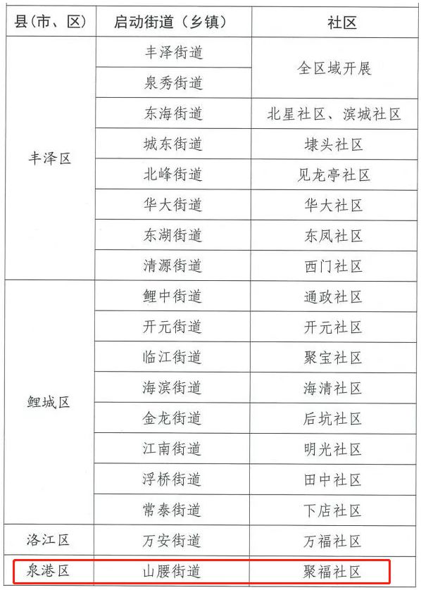鲤城区(8个):金山社区、南益鲤景湾二期、辉映江山、中骏四季阳光、国泰观邸、南益湖景花园、伍堡社区、龙岭社区