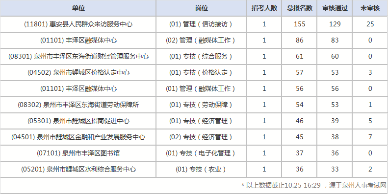 截止10月25日16:29,岗位竞争比最高的依旧是(11801) 惠安县人民群众来访服务中心-(01) 管理(信访接访)岗位,当前已报名155人,审核通过129人。其次为(01101) 丰泽区融媒体中心-(02) 管理(融媒体工作)岗位,已报名86人,审核通过83人。该岗不限专业!不限学历类别!本科起报!