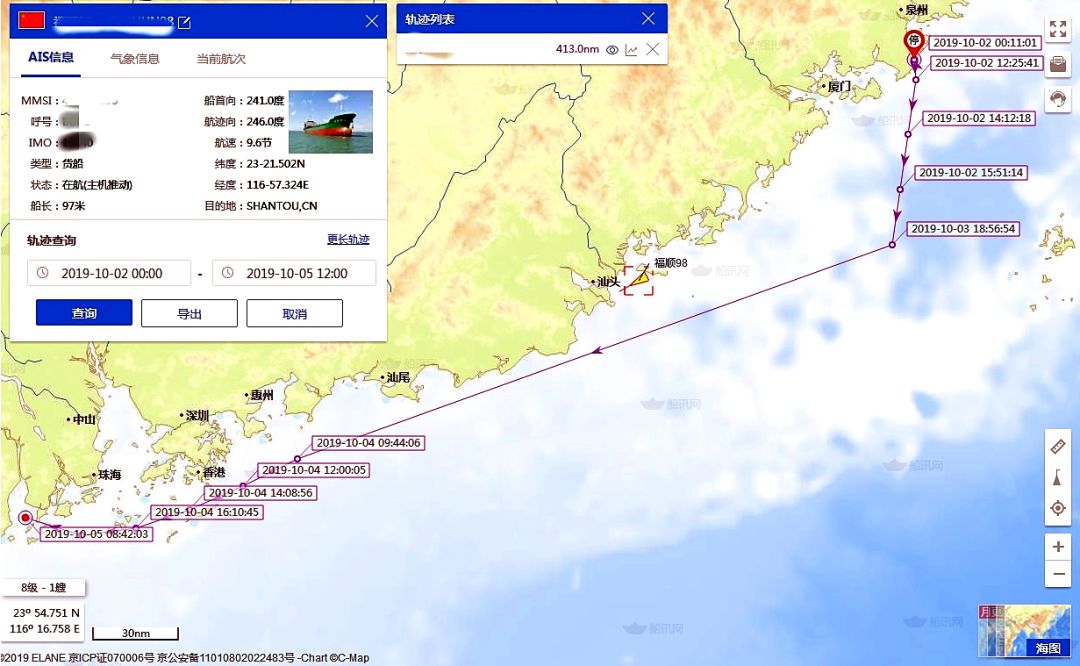 排查期间,泉州海事部门发现“福XX”轮于10月2日向泉州港报告空船出港南下,在核查AIS动态轨迹时发现该轮在10月3日存在AIS信号异常的情况, 10月6日装载5000吨矿物性材料向广东报告进港。泉州海事局已依相关规定对该轮发出船舶协查,并通报船籍港、目的港及途径相关海事部门进一步调查处理。