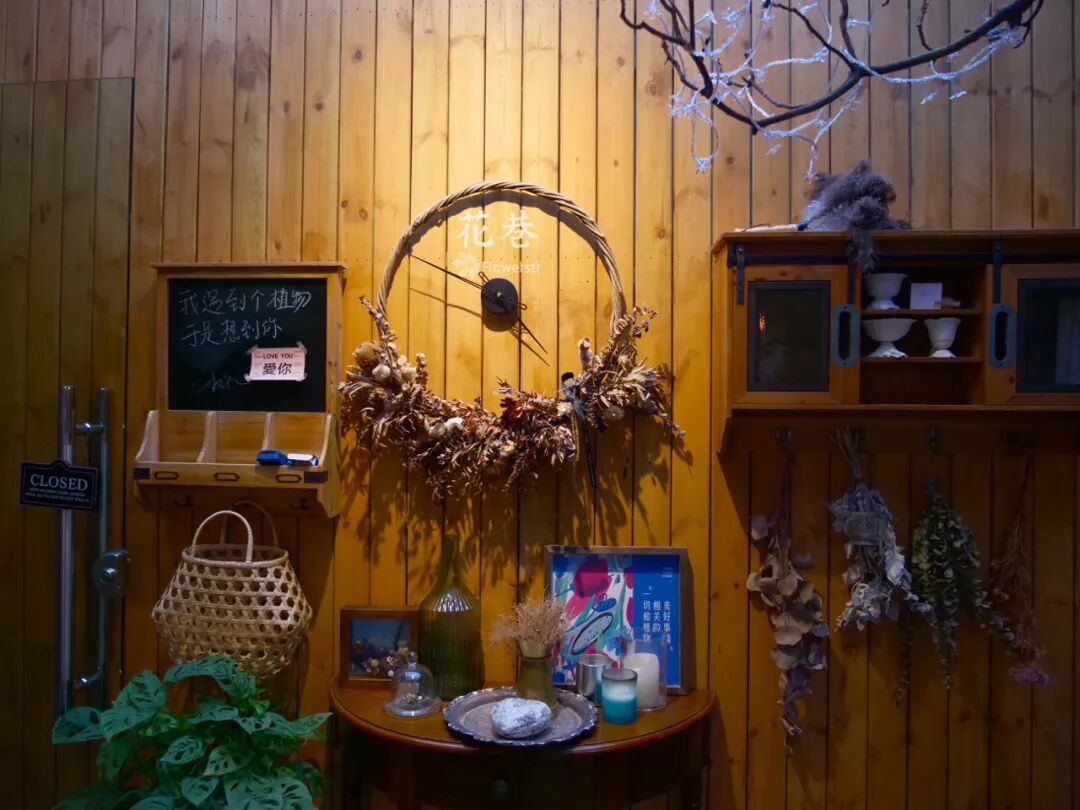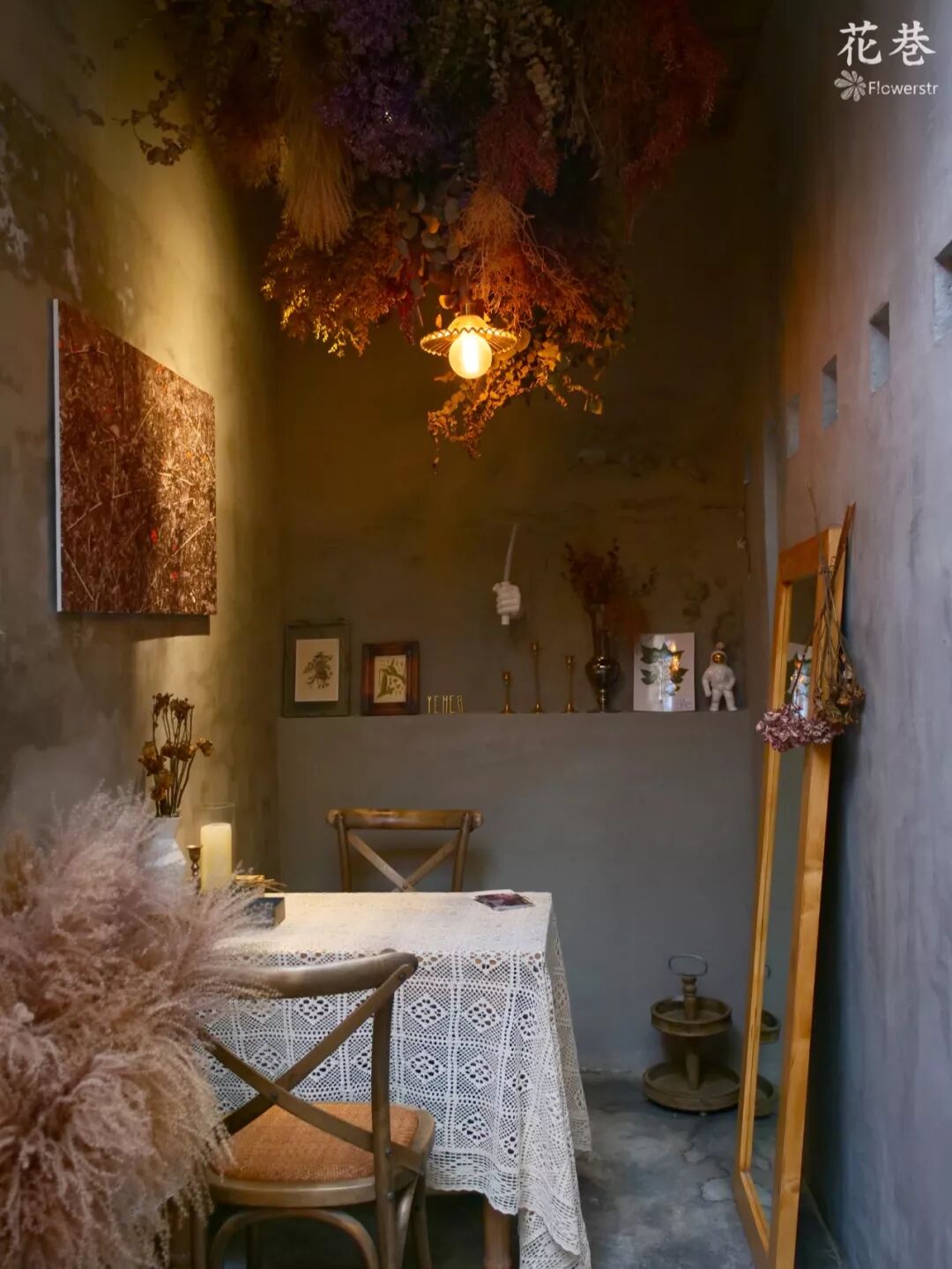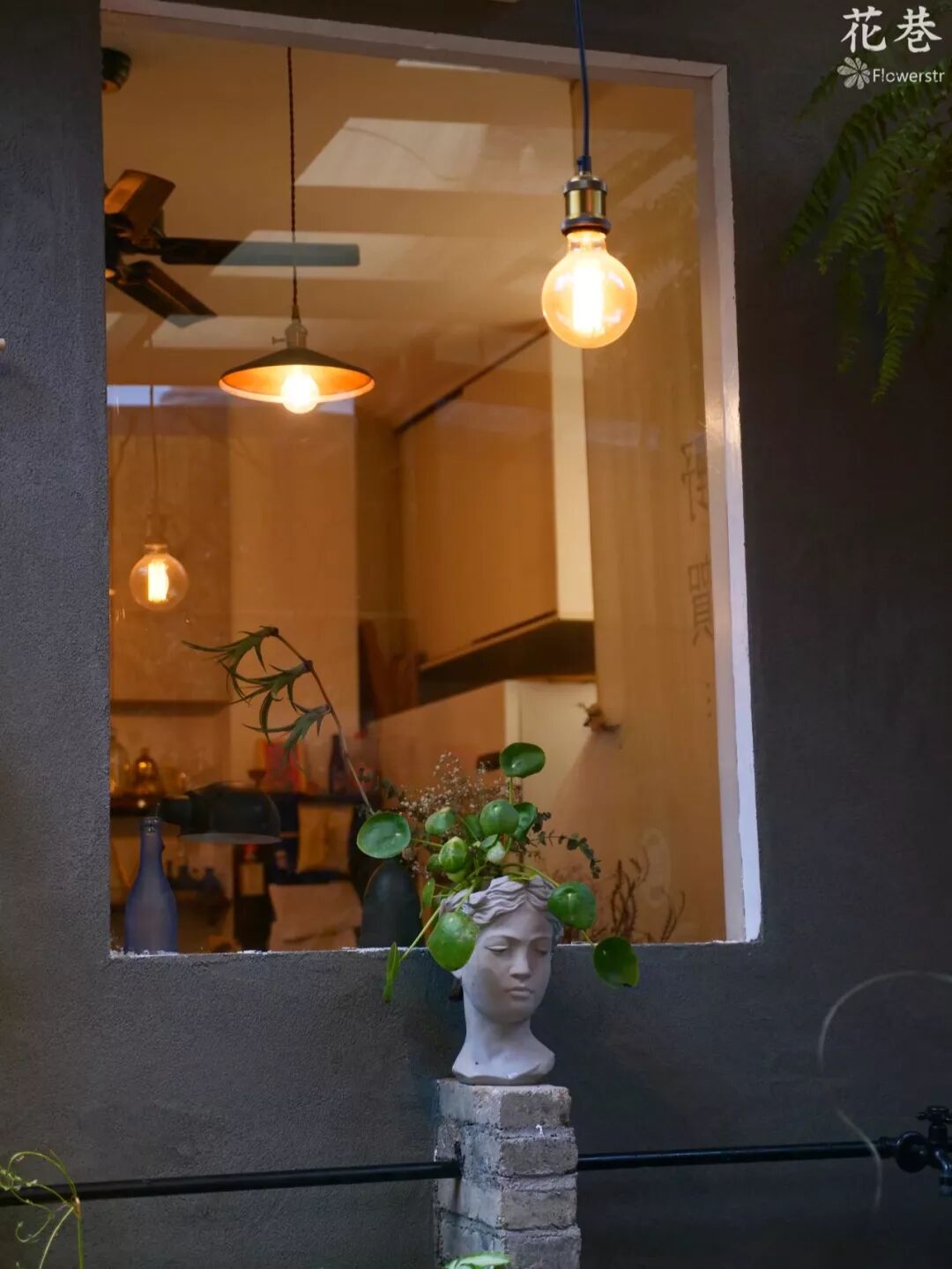 「大自然的馈赠」 穿过西街西段不近民宿的窄巷子,安娜的理花厅就开在有玻璃屋顶的院子里。那棵她喜欢的枇杷树在其他植物相继到来后意外地死去了,怕它寂寞,主人在光秃秃的枝干上缠绕了暖色系的樱花灯。 朋友在某个傍晚到来,看着点了灯的枇杷树说,“一到晚上它好像活过来了”。 整个院子也是。安娜动手改造之前,这里曾经是一个废弃的空地,小吃的破摊子就丢在角落,一间两扇门的封闭小房间孤零零落在后方。
