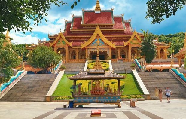 佛寺依山而建,以东南亚国家寺庙建筑和佛像为主,充分展示了南传佛教的历史与传统文化色彩。