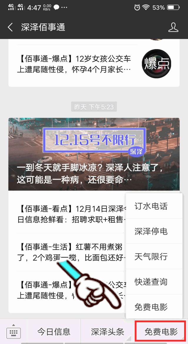 “深泽佰事通”公众号为了给百姓更好更便捷的体验,菜单栏特意更新了<免费电影>,长期免费看腾讯/优酷/爱奇艺/土豆/搜狐/芒果/及各大网站VIP电影~看电视无广告~以后就不用买视频会员喽~