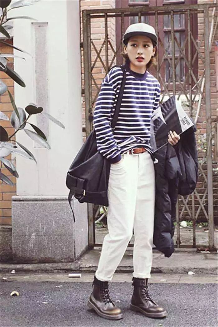 宽松的牛仔裤 + 马丁靴会有一种男友风的酷感。只不过需要注意的是,宽松的裤腿无法扎进靴子里,所以最好把裤长控制在鞋帮处,才不会压身高。