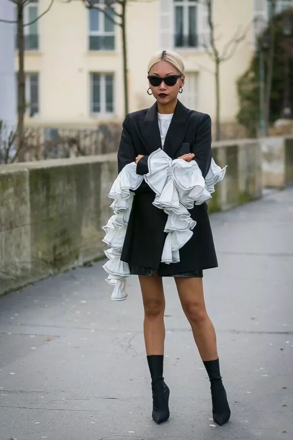 搭配半身裹裙或者衬衫裙是一种不太日常的时髦穿搭,更适合身高较高有气场的女孩子。