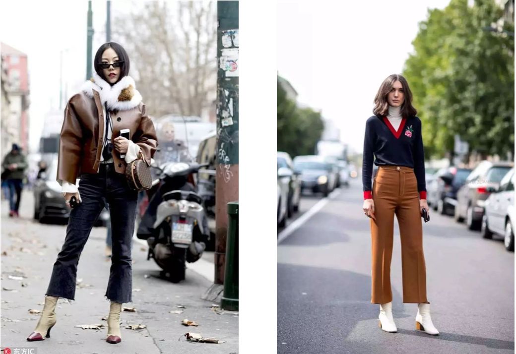 九分喇叭裤、直筒裤和阔腿裤搭配袜靴,有一种刚柔并济的感觉。