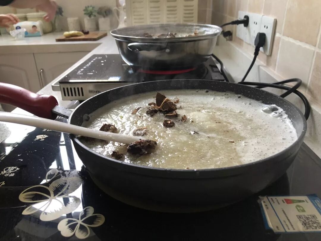 冷却后用滤网过滤梨汁,转小火慢熬