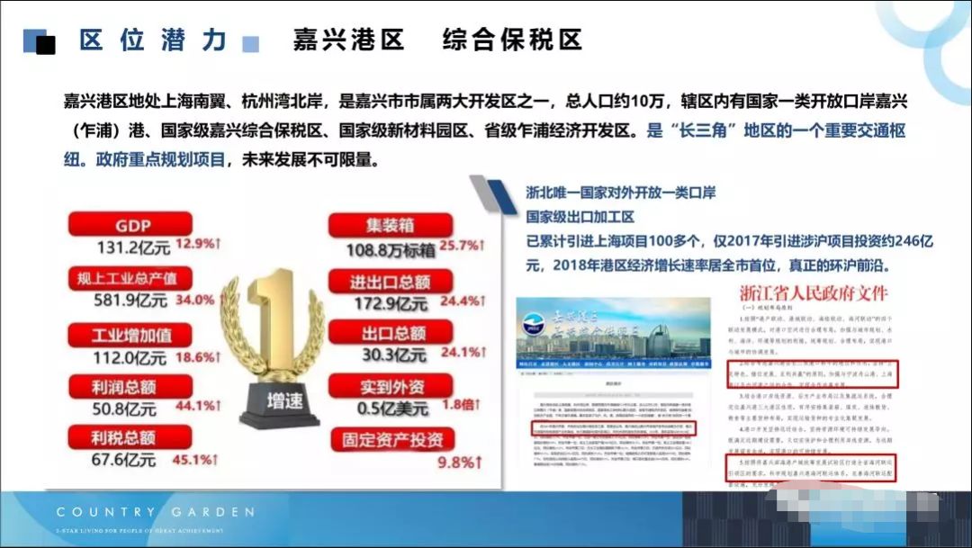 嘉兴港区作为国家一类开放口岸,是上海国际航运中心重要配套港,承接上海外溢产业的“桥头堡”。已累计引进上海项目100多个,仅2017年引进涉沪项目投资约246亿元,2018年港区经济增长速率居全市首位。未来港区比肩世界。已汇集523家中外企业,越来越多的企业入驻,驱动人口导入,住房需求将推动房价攀升。
