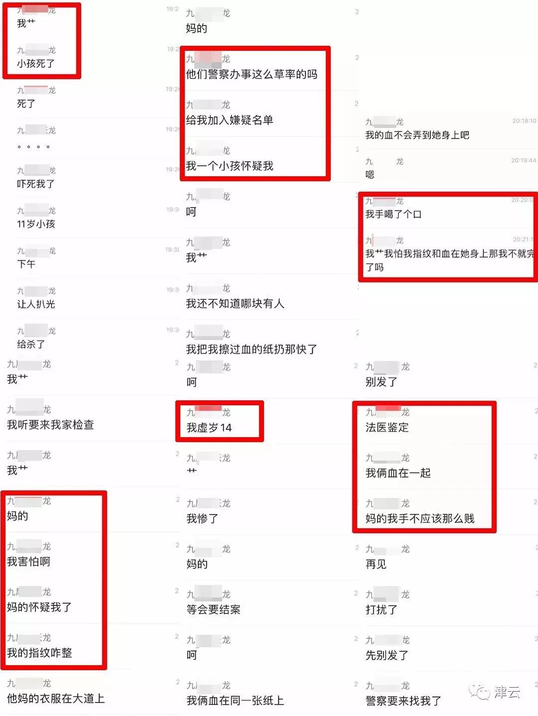 王萱的母亲贺薇向记者展示了一份蔡某某20日晚上的群聊记录,据她介绍,这是案发后一位蔡某某同班同学的家长发给她的,上面记录着蔡某20日晚上在行凶后到被警方控制这段时间的部分言论。在这份聊天记录中,蔡某某于当日19:30左右在班级群发了一条从自家窗户拍摄的搜查现场视频,并对同学说:“小孩死了,让人扒光给杀了,就在我家门口对面。”20点左右,他继续写道:“他们警察办事这么草率的吗,给我加入嫌疑名单,我一个小孩怀疑我,我把我擦过血的纸扔那块了,我的血不会弄到她身上吧?我怕我的指纹和血在她身上,那我不就完了吗?”等内容。20:30左右,蔡某某继续在班级群中对同学说了“我害怕啊,怀疑我了,我的指纹咋整,好像确定了是小孩干的,我虚岁14。” 等内容,并表示“法医鉴定我俩血在一起,我手不应该那么贱,警察要来找我了,我录音给你们听,你们别发微信”。