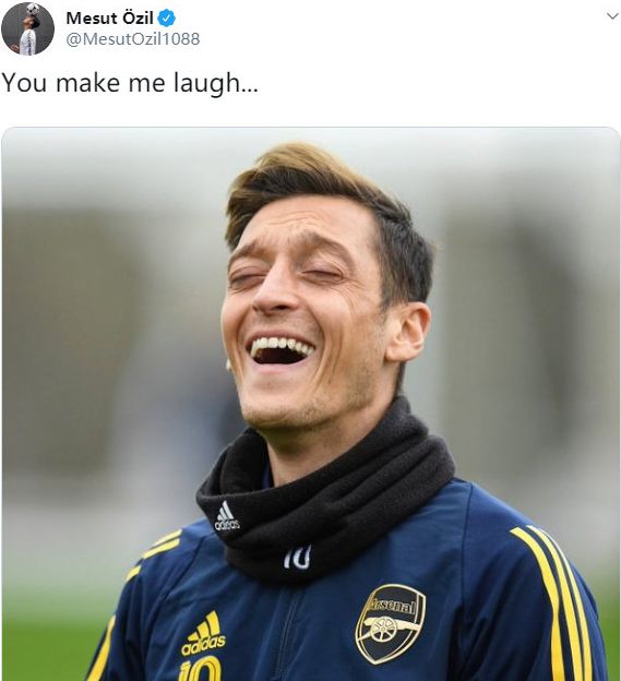 赛前厄齐尔在推特晒出一张搞笑表情囧照,并配文:给爷整笑了…….