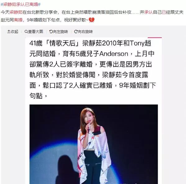 梁静茹跟其老公赵元同的婚姻一直被外界所议论,前几日传离婚后被男方及女方公司高层否认,后又传出分居。就在昨天,梁静茹在新专辑发布会公开承认已经与丈夫赵元同离婚正式离婚,儿子由双方共同抚养,为九年婚姻画上句号。