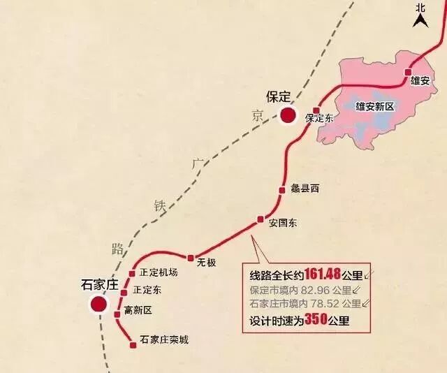 石雄城际铁路(保定东至石家庄段)的线路、站点等得到确定。该城际铁路设计时速为350公里,建设工期为三年半。