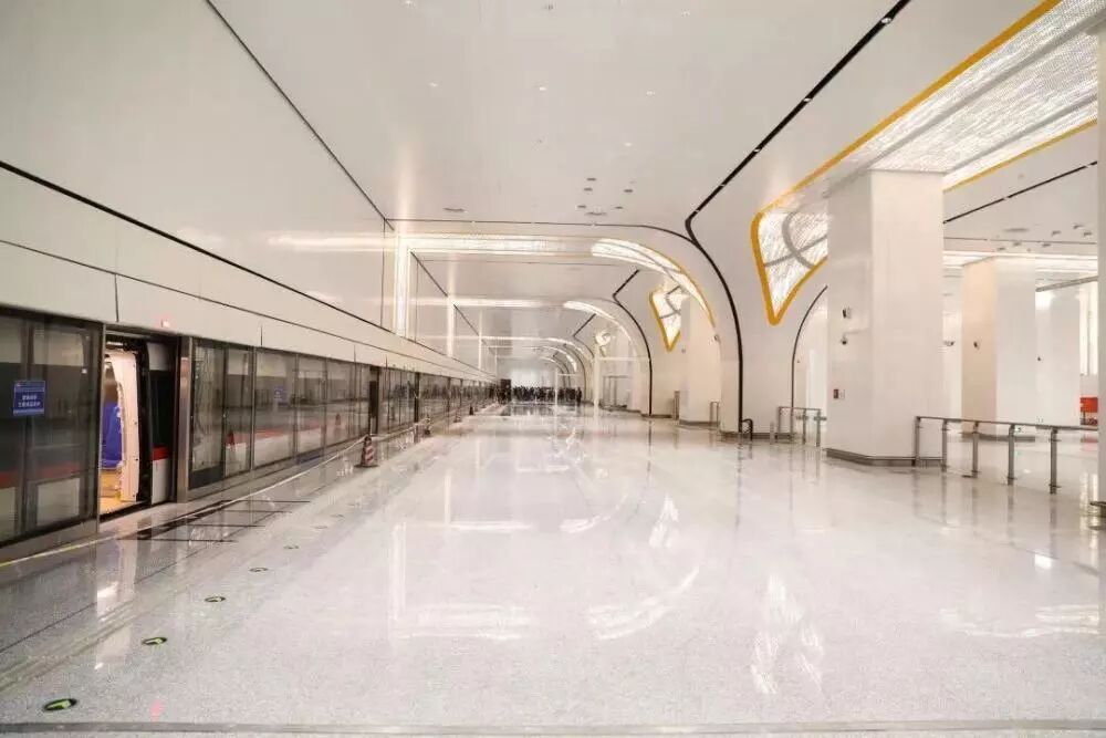 地铁:大兴新城站整座车站简约大气,采用纯净的蓝白色调装饰,高达6米的吊顶设计成海浪样式,营造出一种碧波荡漾的“海上丝绸之路”效果。