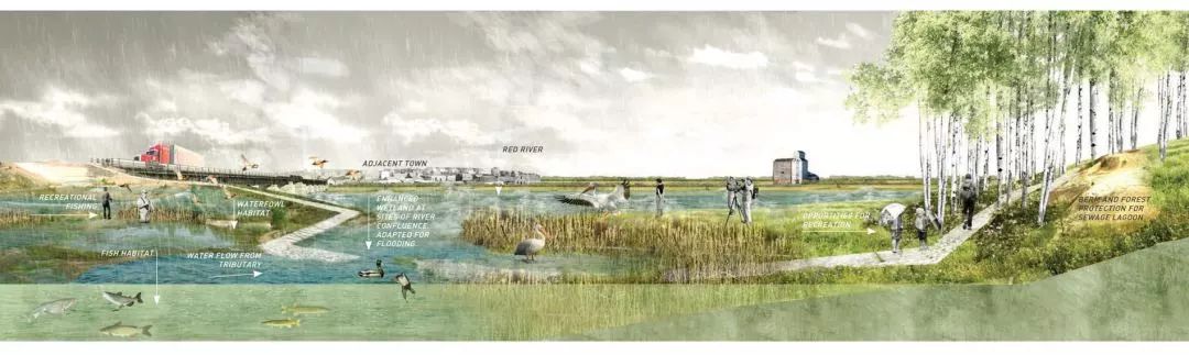 本作品致力于将连接人与自然环境的全新纽带象征化。(这个建筑)由一系列非常有诗意和创意的构造网支撑着古法样式的坡屋顶,从而获得全新的公共空间。多种多样的活动可以在水边进行,人与自然的纽带将重新被建立。