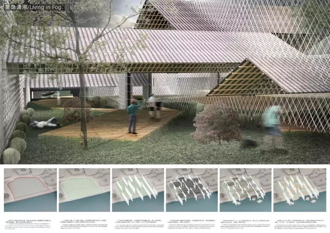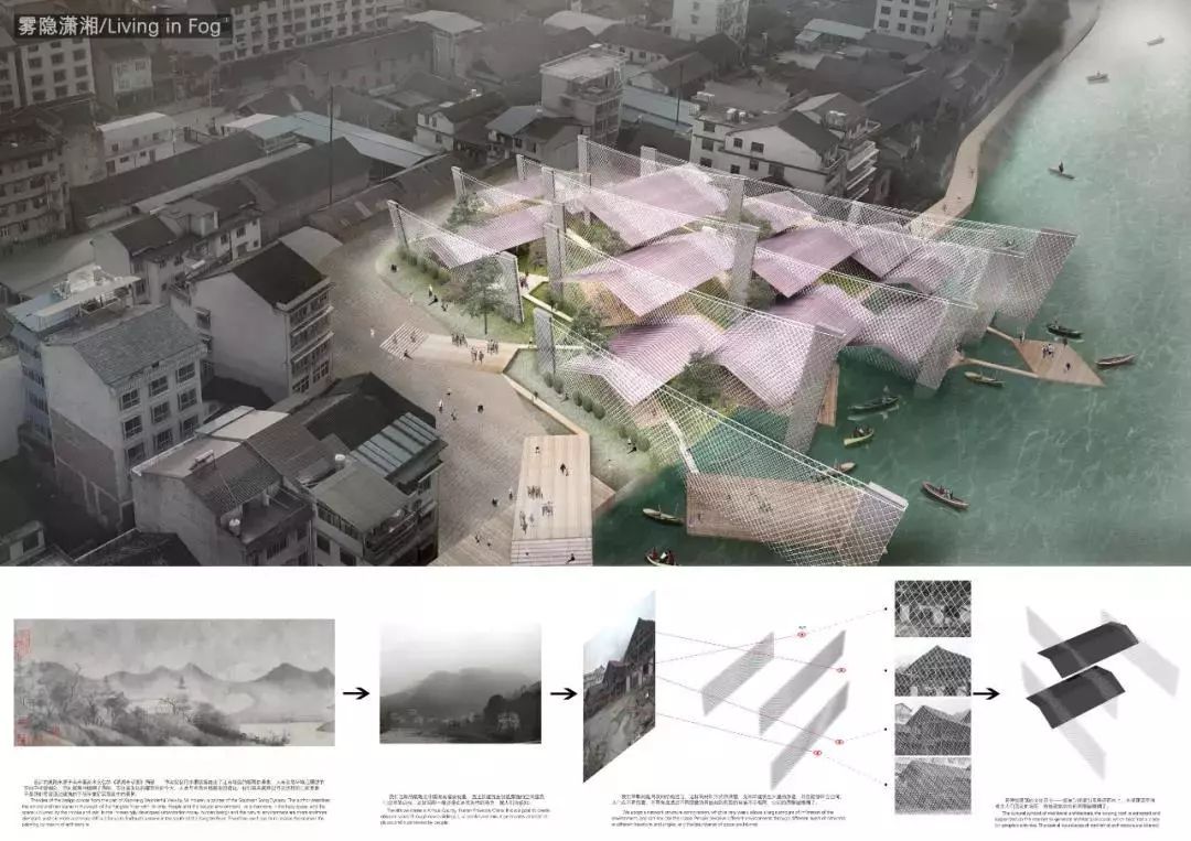 The idea of the design comes from the part of Xiaoxiang Wonderful View by Mi Youren, a painter of the Southern Song Dynasty. The author describes the smoke and rain scene in the south of the Yangtze River with ink only. People and the natural environment live in harmony in the hazy space, and the space is blurred by the smoke and rain. In the increasingly developed urbanization today, human beings and the natural environment are more and more alienated, and it is more and more difficult for us to find such a scene in the south of the Yangtze River. Therefore, we hope to re-realize the scenein the painting by means of architecture.