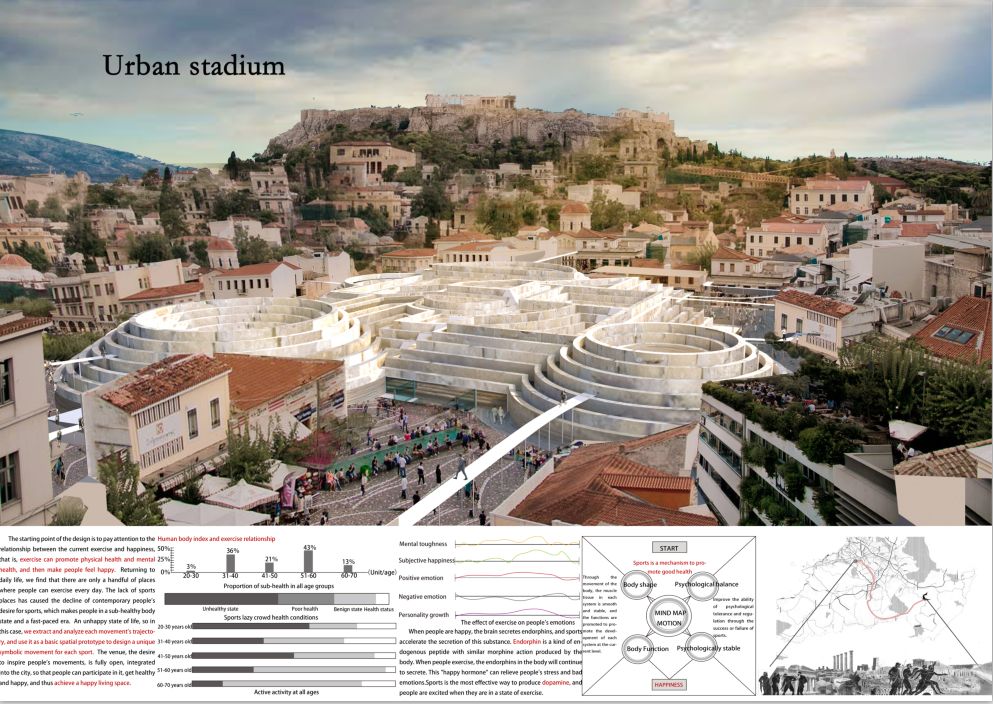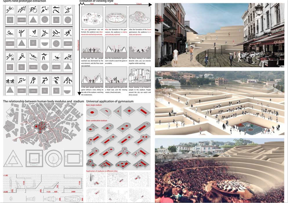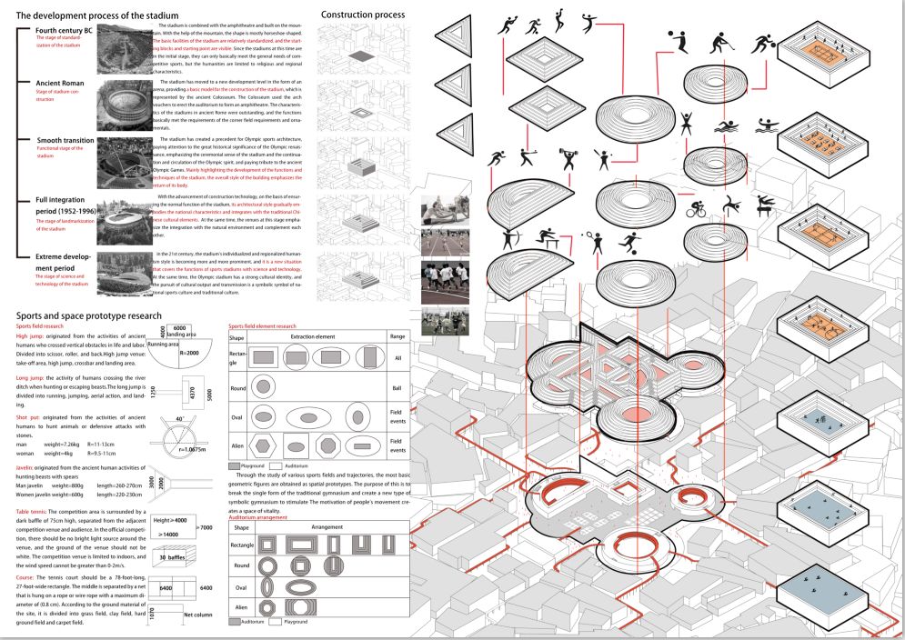 设计的出发点是关注当下运动与快乐的关系即运动可以促进身体健康和心理健康,进而使人感受到快乐。回归到日常的生活中,我们发现人们日常能够运动的场所屈指可数,运动场所的缺失造成了当代人运动欲望的减退,使人们在快节奏的时代下处于一种亚健康的身体状态和一种不快乐的生活状态,因此在这种情况下,我们通过对每一种运动的运动轨迹的研究,进行提取和分析,作为基本的空间原型,设计出每一种运动独有的符号化运动场地,激发人们运动的欲望,并且全面开放, 融入到城市中去,使人们都参与到其中,获得健康和快乐,从而实现乐活空间。