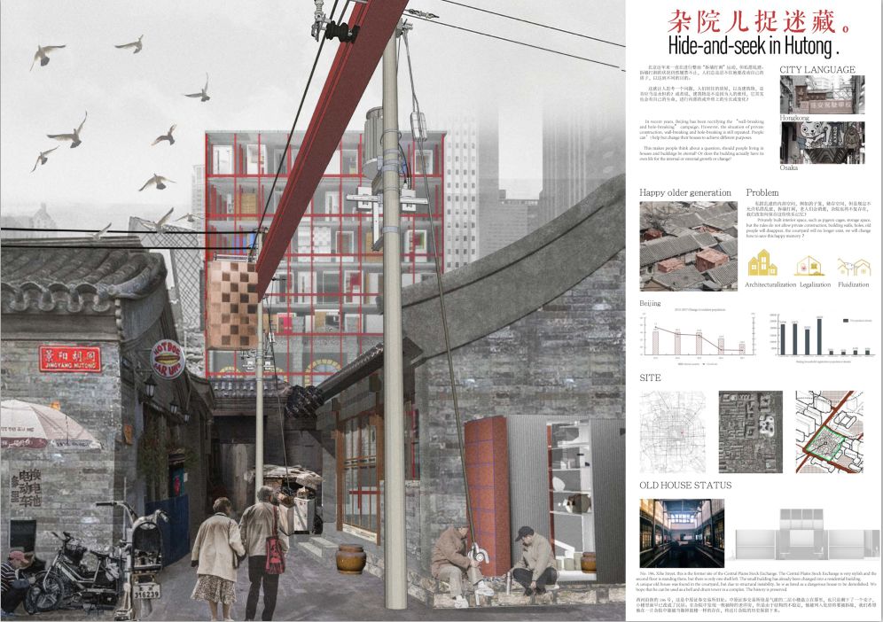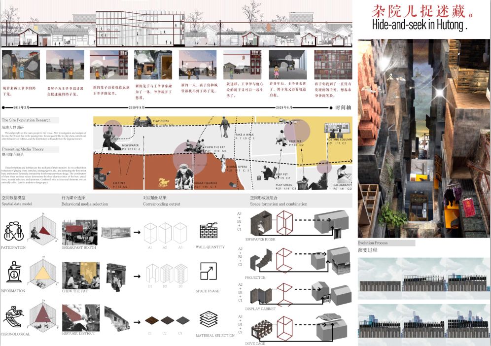 北京老城区处于人群,建筑,城市规划的剧烈更新的状态,原住民为了维护自己的权益,人们会产生一种“自救行为”,即私搭乱建。但随着政策变动,人口老龄化加剧。最后这些非正式建造也会逐渐消失,街道最终肌理的消失已经是一种必然趋势,胡同终究会失去那些属于住户的“记忆符号”。我们打算在这样一种背景下,探讨一种“非正式建造”的新方式,通过定制的方式制造属于每一户居民的记忆盒子,可以把一些记忆藏起来的盒子,并且在多年以后,可以被大家找到,哪怕当时胡同立面,街道肌理都已经不存在,但只要这些记忆盒子可以继续发挥纪念作用,那么胡同就会存在,它只是以另一种形态偷偷藏起来了。