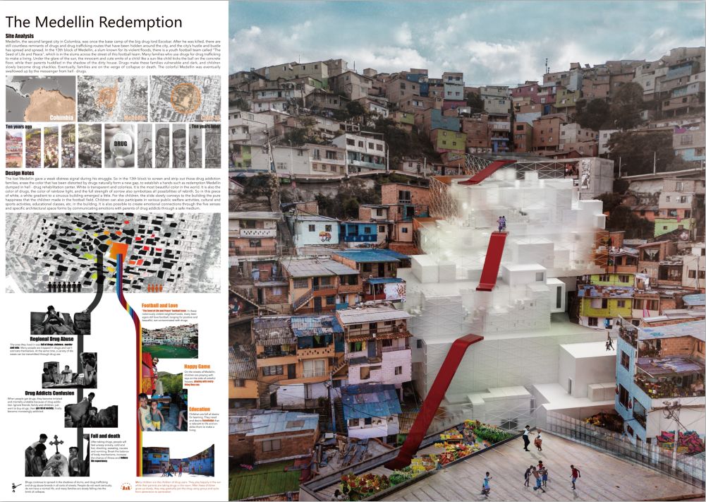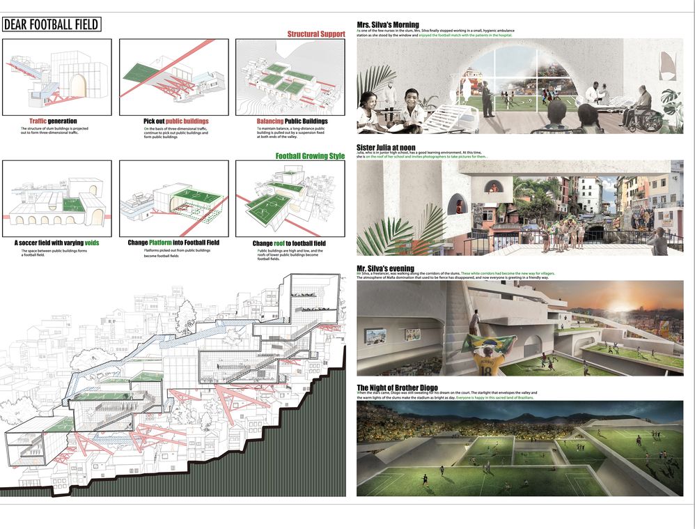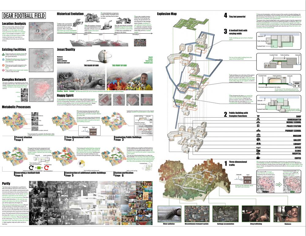 在圣经中曾经定义过正义和邪恶的两面,我们的场地不幸地存在于耶稣的背面,所以无论怎样定义这块场地,人们世俗化的理解便认定了它就该如此黑暗邪恶。面对问题如此巨大的场地连政府都素手无策,建筑师又该怎样头脑风暴。但是有一位大师给了我们答案,他就是伟大的城市规划师麦克哈格,他的田园城市理论就是这个设计最核心的原则。以尺度的放大或缩小去体现整体的田园精神,以小见大的核心并不指是足球场与人的关系那么简单,足球场就是巴西这座田园城市中人们心中,代表着梦想与自由的核心节点。所以垂直环形的交通,直线的快速通道,便成为足球场与人的联系。同时,周围的贫民窟就是最基础的城市产物,平白而整齐地存在于城市之中。凭借足球场的力量,城市也因此乐活。当梦想和希望植入城市之中,原本桎梏于黑暗的城市也由此熠熠生辉。