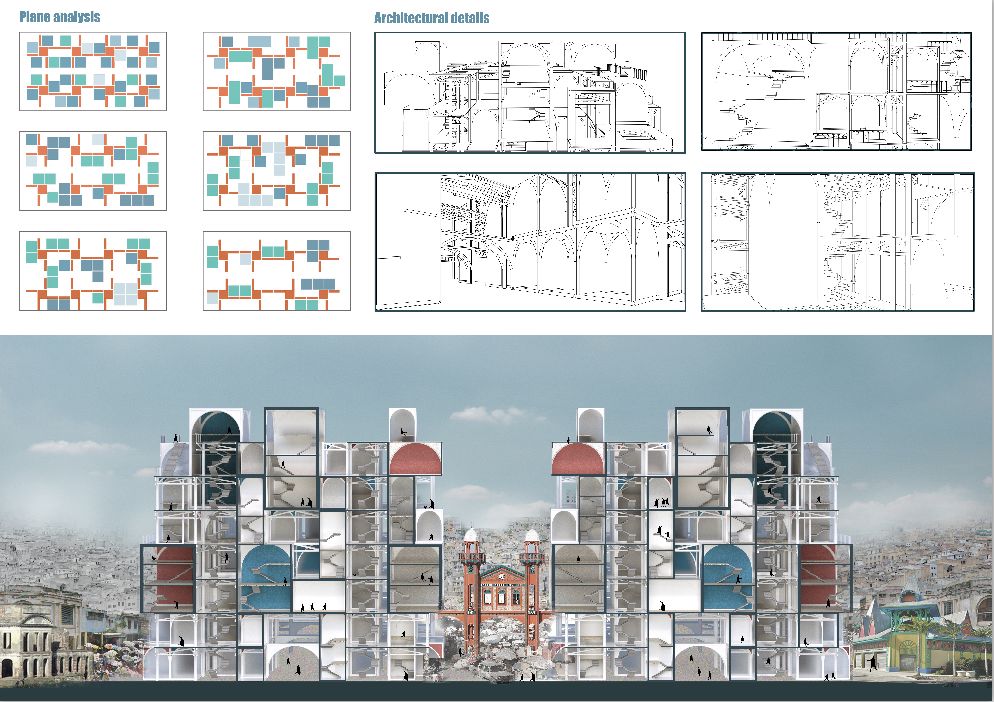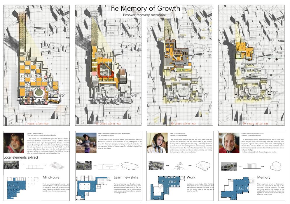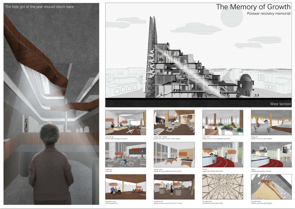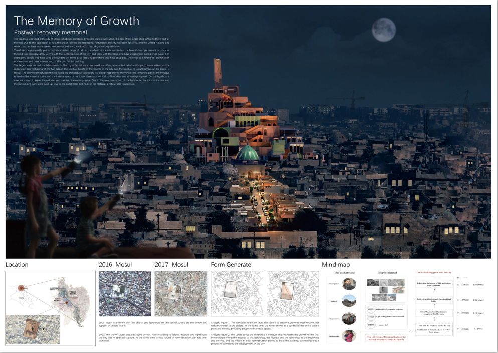 在mosul城中曾经最大的一座清真寺和最高的塔被损毁,而它们在某种程度上代表着信仰与希望,所以二者的恢复与重塑对于城市中人民的精神信仰的重建和场所精神的再造是至关重要的。两者间用建筑的语汇使其发生联系则是在设计上对场所的回应。将清真寺遗留下的部分作为入口空间,塔的内部空间作为竖向交通核和中庭采光井。在立面上清真寺采用修旧补旧保持现有遗址,适当增加功能空间。灯塔由于全部被损毁,采用场地内及周边被清理的废墟材料堆砌而成,由于材料自带的弹孔和孔洞,形成天然的伤痕感。