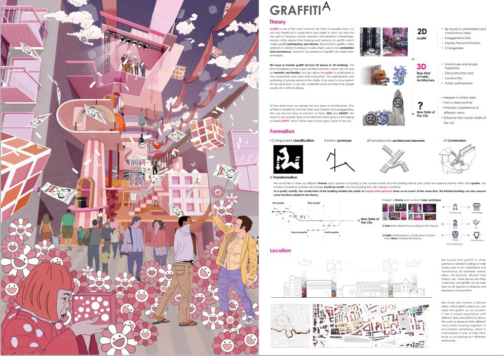 建筑到底是工程学还是艺术这个命题一直以来都是一个业内一直坚持探讨的内容,UCL 一直致力去证明这个复杂的议题。3D 涂鸦是一次创新性的表达,被广为所知的是许多大师都是从浩若繁星的艺术作品中得到灵感而逐渐形成自己的风格。而对于涂鸦而言,它虽然来源于生活,但是因其随意的绘画方式、随处的创意表达,在艺术圈子里面仿佛只被一部分人接受。但是乐活的定义也正是源自于平民的生活,这个方案有一股巨大的内在动力就是平民的艺术力量,这个设计也必将成为平民与艺术家从新定义城市的一种先锋。它承载的是艺术最原始的原生力,从此这个闪建筑会是第一个结合建筑本身、艺术、展览、活动的新动态建筑。只要人们需要它,它就会随时出现,闪建筑也因此而来。
