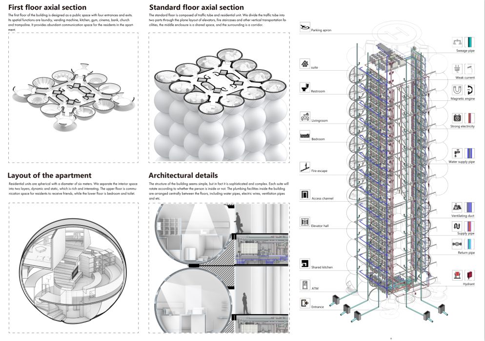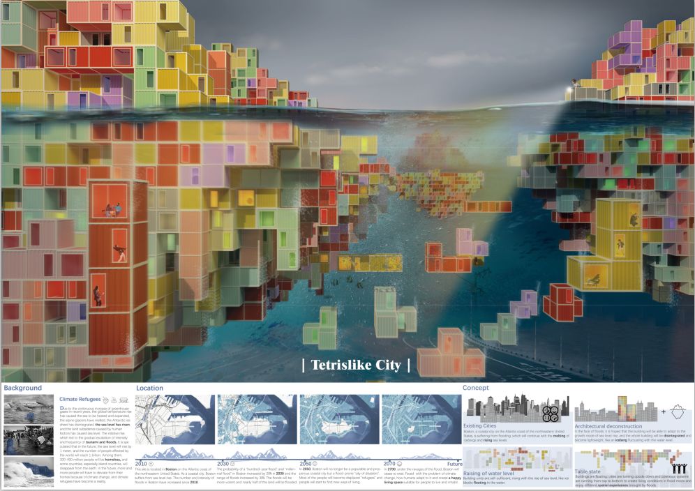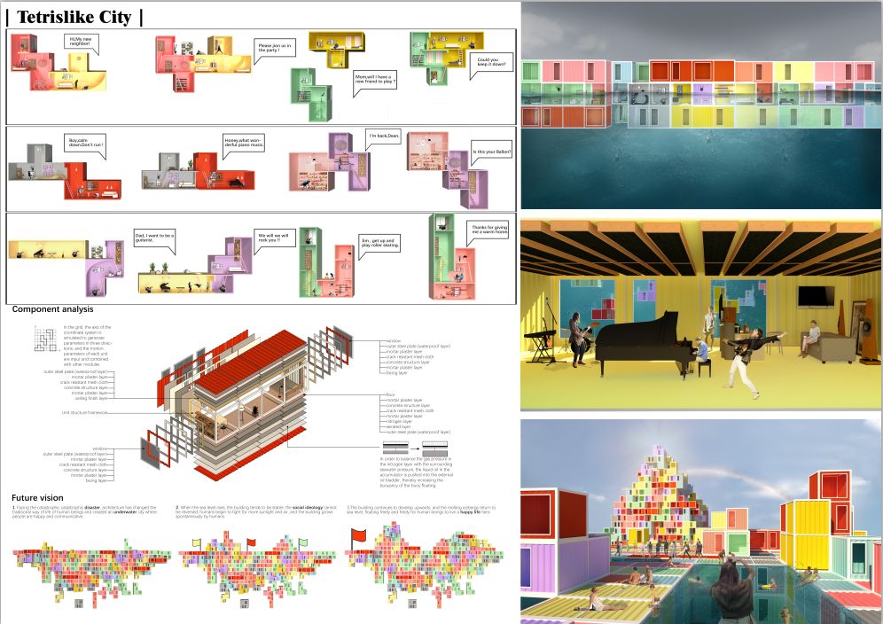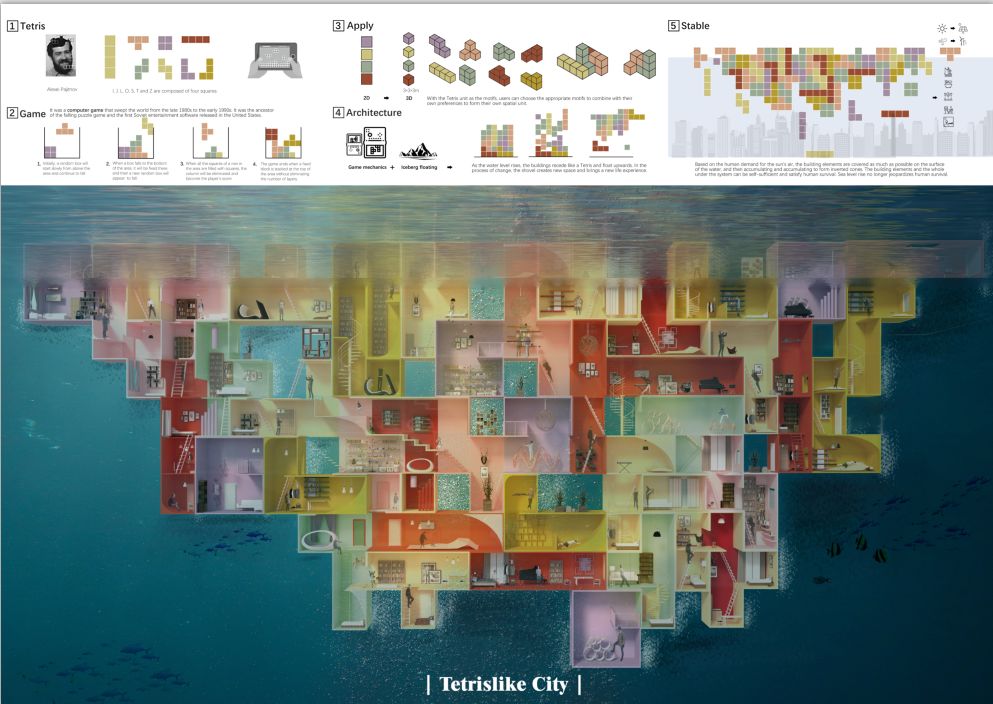 生命的永动的,人类是伟大的。在这个地球上一直有一句适者生存的话,谁适合谁就可以生存,冰山在快速融化,海平面在快速升高,聪明的人类该顺应这样的规律,这种建筑就应运而生,再大的灾难,乐观的面对总会有更好的方式。所以这个建筑核心就是适者生存,就像防震结构一样,总有一天,它会变成现实,但是这个建筑的有趣所在,就是单体与城市的关系彼此独立,简单且纯粹。就如俄罗斯方块般的堆叠,从1 到 10000 的形成过程也象征着城市的变迁。所以即使是很简单的城市构成,也能将平等和权利这两件事情用更为简单的方式呈现出来,用五味杂陈的心情去分解快乐,不管是最快乐的形式,还是最快乐的心态,终究逃不过现实的逻辑。