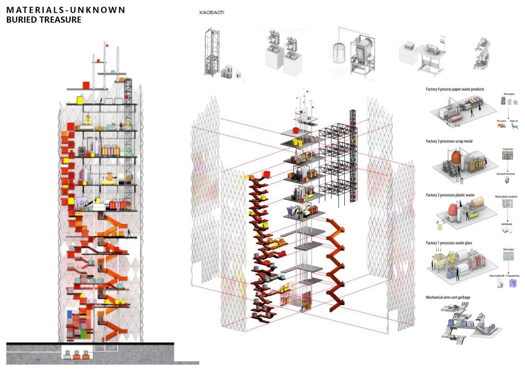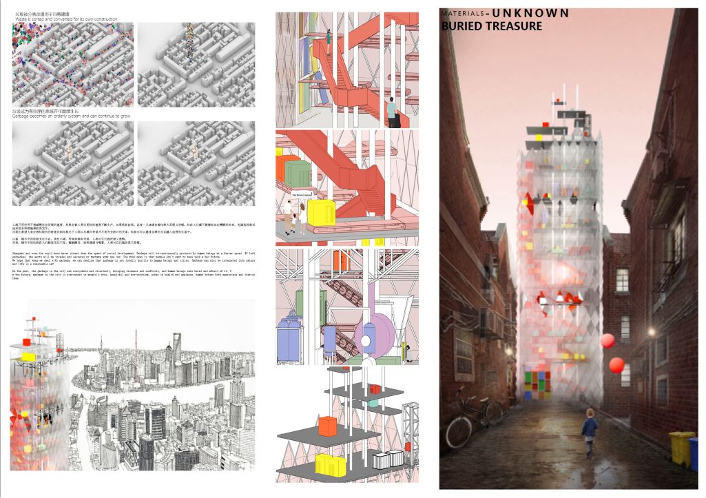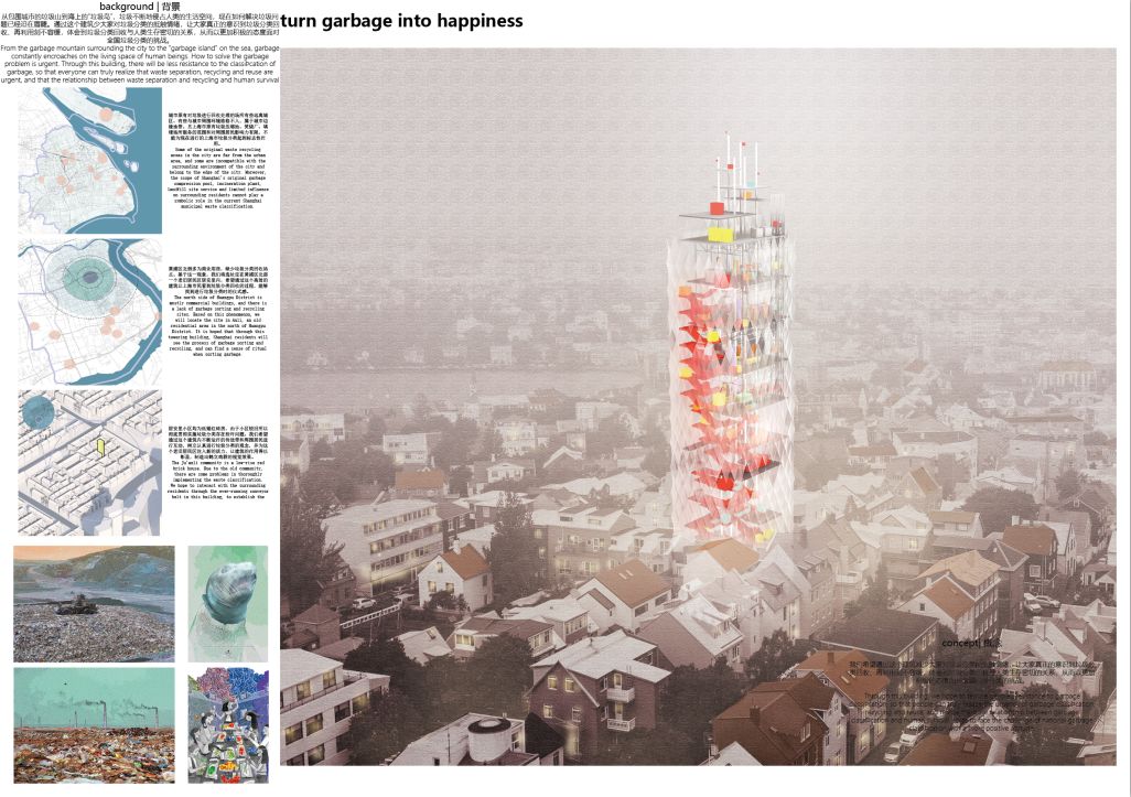 我们将选址设在上海市黄浦区居安里水塔的原址上,利用回收的垃圾重新制成建筑材料,实现建筑的竖向生长——蓝色代表铝铁等金属类制品回收后制成钢结构、橙色代表废弃的塑料制品回收后成为建筑表皮、红色代表遗弃的玻璃回收后制成运输垃圾的盒子和工艺品、黄色代表被遗弃的纸质物品回收后回归居生活在进行利用。我们希望通过这个建筑减少大家对垃圾分类的抵触情绪,让大家真正的意识到垃圾分类回收、再利用刻不容缓,体会到垃圾分类回收与人类生存密切的关系,从而以更加积极的态度面对全国垃圾分类的挑战。
