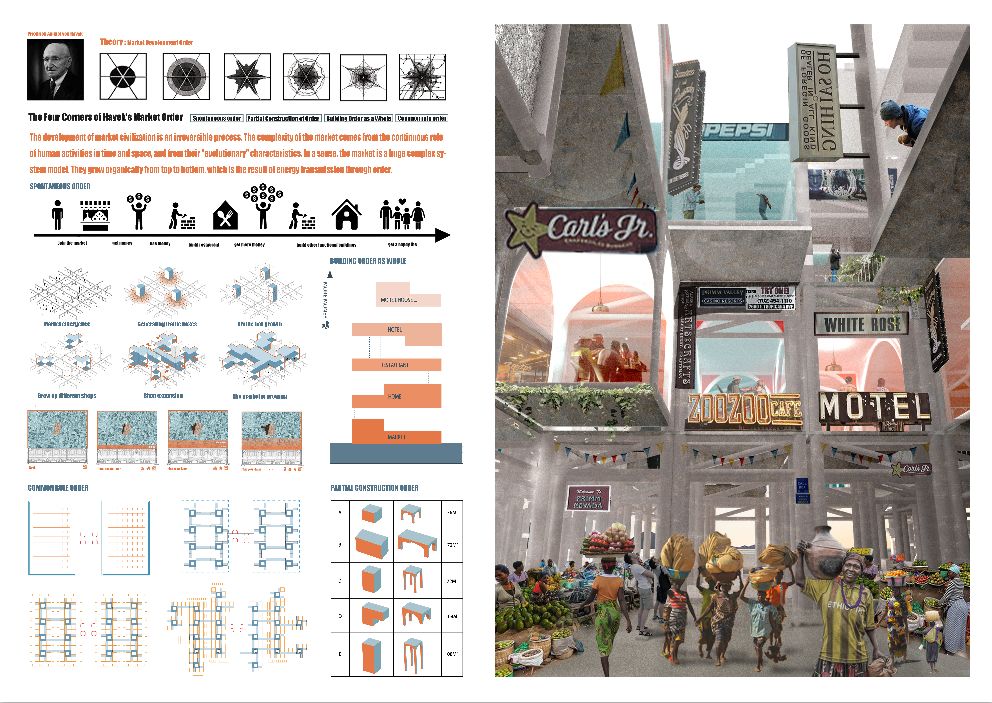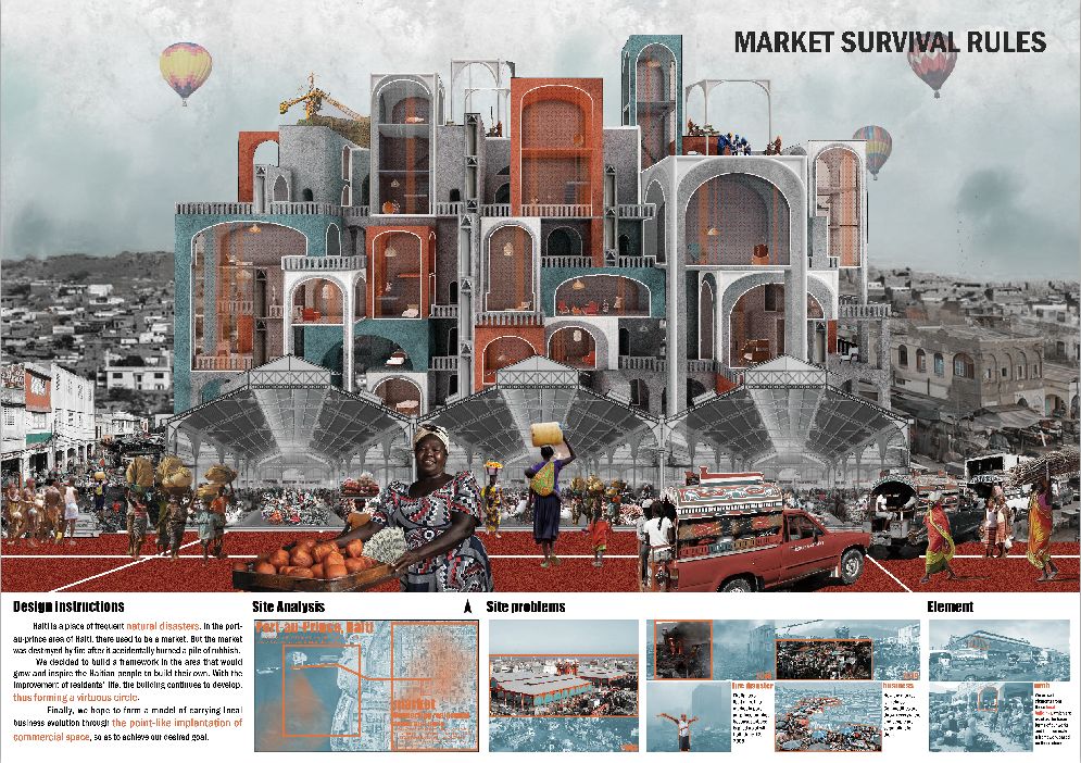 海地是一个自然灾害频发、经济落后的地方。当地经济几乎完全依赖市场贸易和旅游业。在海地的太子港地区,曾经有一个市场。但市场在意外烧毁一堆垃圾后被大火烧毁。由于缺乏工业技术和资金,地方政府没有固定市场。海地人失去了交易空间,正慢慢地在废墟边缘形成一个新的市场。但是,市场落后,不能满足当地市场的需要,抑制了改善居民生活的可能性。我们决定在该地区建立一个框架,增长并激励海地人民建立自己的框架。随着居民生活水平的提高,建筑物不断发展,形成了良性循环。最后,我们希望能透过商业空间的点状植入,形成一个本地业务发展的模式,以达到我们期望的目标。