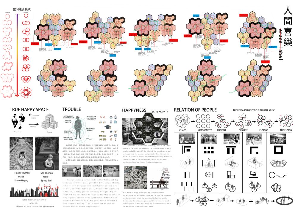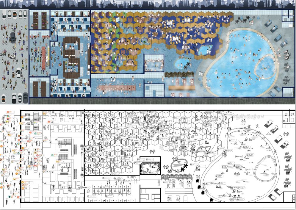 建筑是人们生活的载体,当一个建筑是乐活的时候,其本质是建筑中的人的快乐。在科技时代仍然吸引着人们前往的是浴场空间的快乐氛围,在这个空间中人们逐渐脱去外界的标签,不用再背负来自外界的压力和偏见,像是一个逐渐找回自我的过程,来到澡堂的人带着各自不同的故事,以自由平等的快乐方式进行着交往。这种快乐的人与人相处的模式引起了我们的注意,因此我们以澡堂为原型,研究人与人之间的关系,并解构澡堂空间,尝试创造出一种促使人产生这种快乐交往方式的模式,并可以适用于任何功能空间。