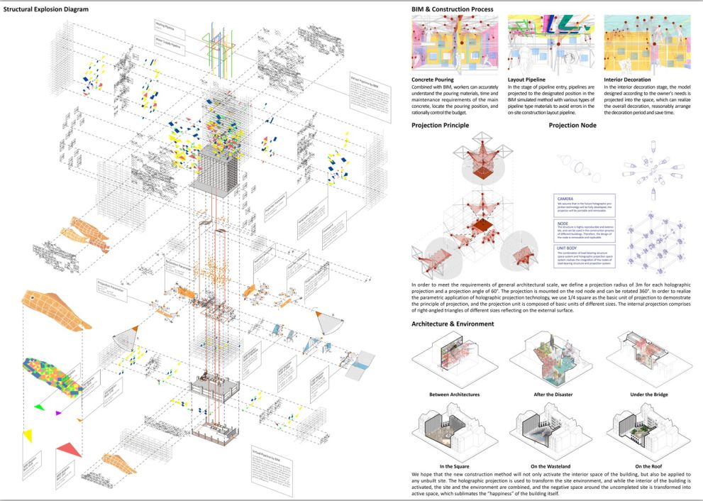 建筑的更新正在成为世界关注的热点话题,这意味着有越来越多的建筑将处于“未建成”的状态中,因此本方案可运用到任何处于该状态的场地中。不仅可以改变建筑外部形态,激活建筑内部空间,更可以运用全息投影对场地环境进行改造,将未建成的场地周边消极空间转化为积极空间。场地与环境同时拥有无限可能性,成为具有无限乐活性的乐活空间。